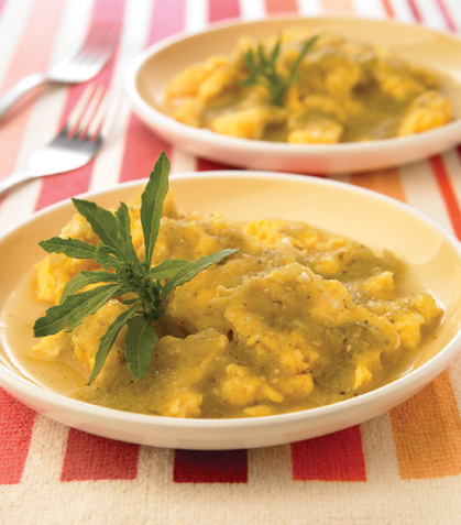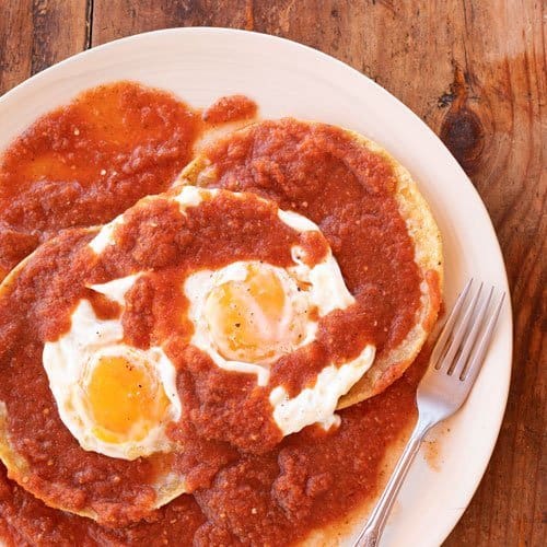 Tortilla dorada quebrada, bañada en salsa roja o verde con queso, crema, cebolla, aguacate, bistec de res asado, acompañados de frijoles refritos, café americano, pieza de pan, un plato chico de fruta.