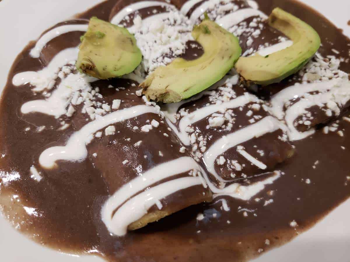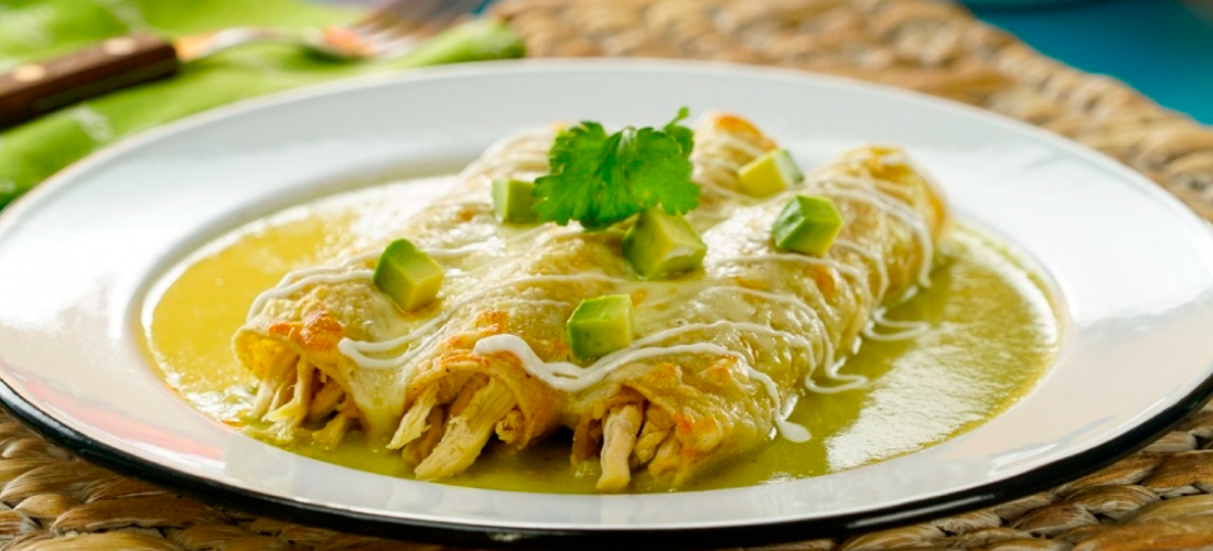 Rellenas de pollo, bañadas en salsa roja o verde, con lechuga, queso, crema, cebolla, aguacate y frijoles refritos, incluyen agua del día, sopa, intermedio, postre y tortillas.