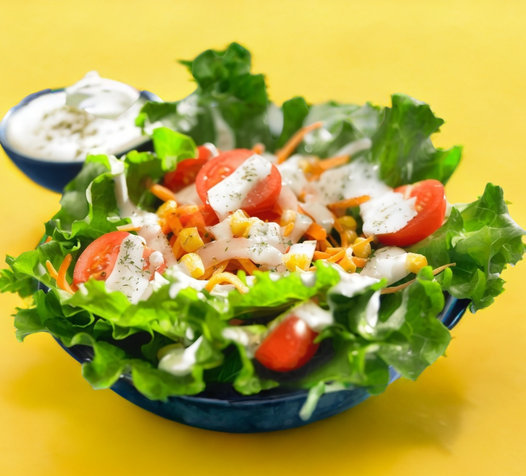 A base de lechugas con rebanadas de pepino, manzana, tomate rojo, cebolla y aguacate.