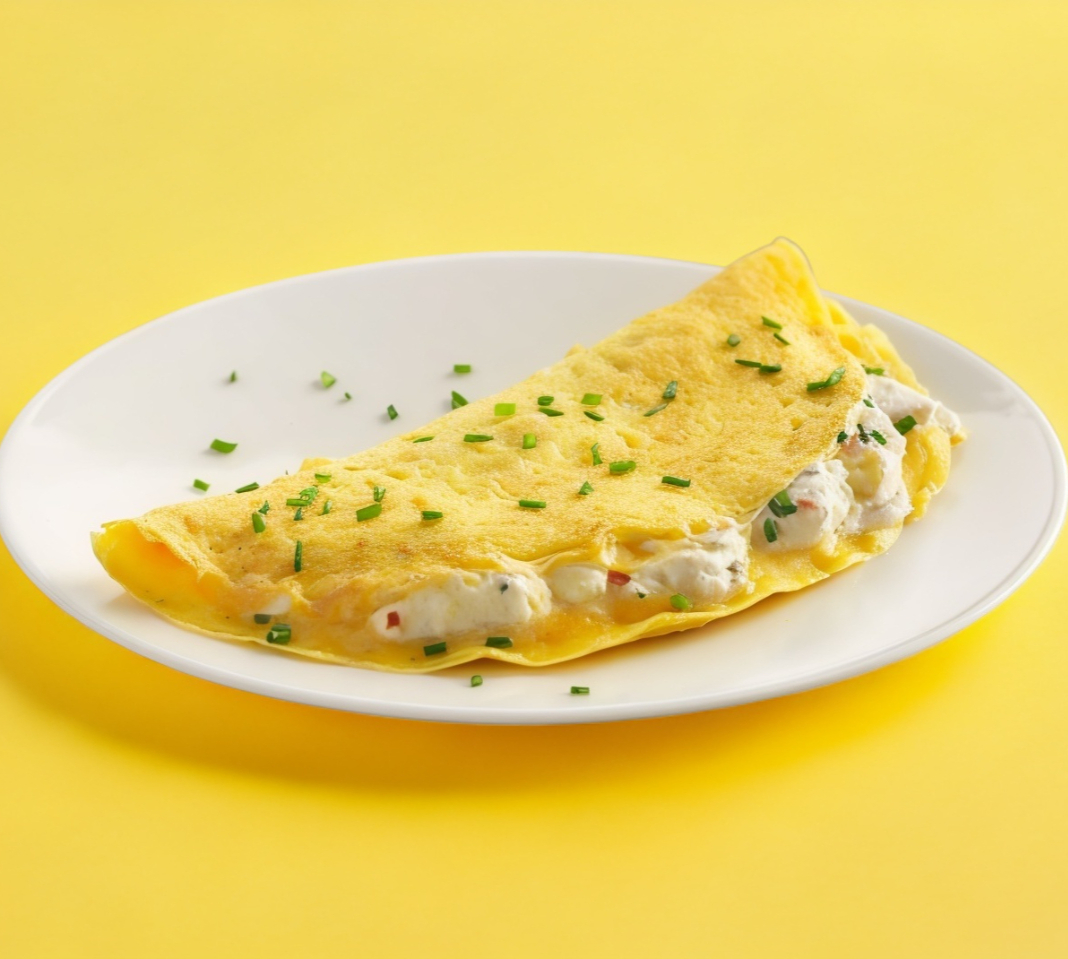 Omelette relleno de queso de hebra con jamón, bañado en crema de frijol con chipotle, café americano, pieza de pan, un plato chico de fruta y tortillas.
