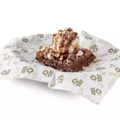 Un brownie esponjoso y calientito con una bola de delicioso helado de vainilla cubierto con chocolate y trocitos de nuez.