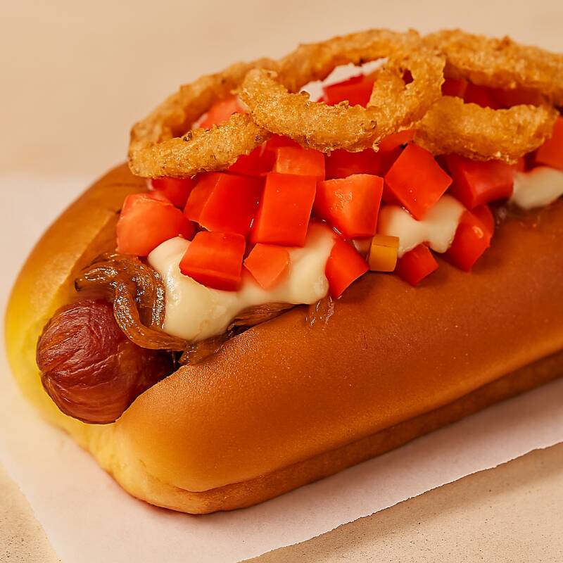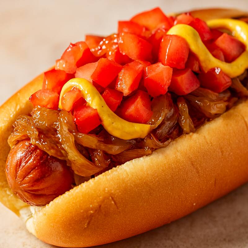 Hotdog con jitomate y cebolla caramelizada en pan brioche