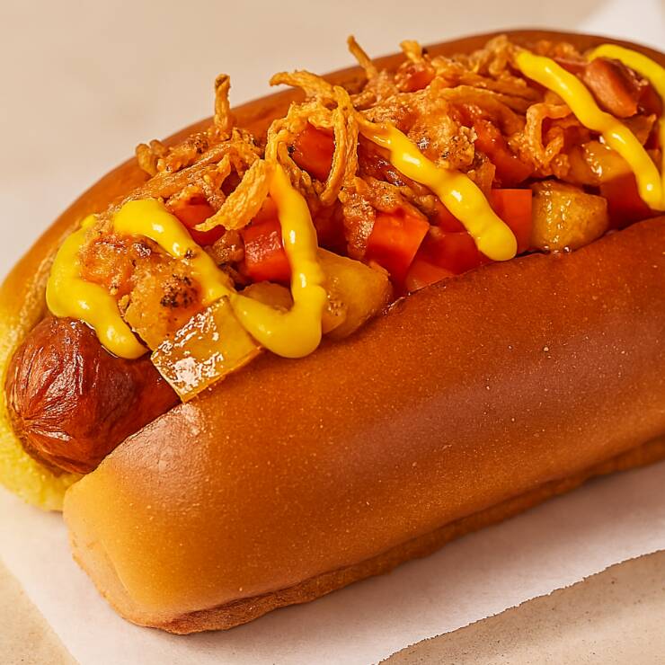 Hotdog con jitomate cebolla crispy y piña caramelizada, mostaza en pan brioche