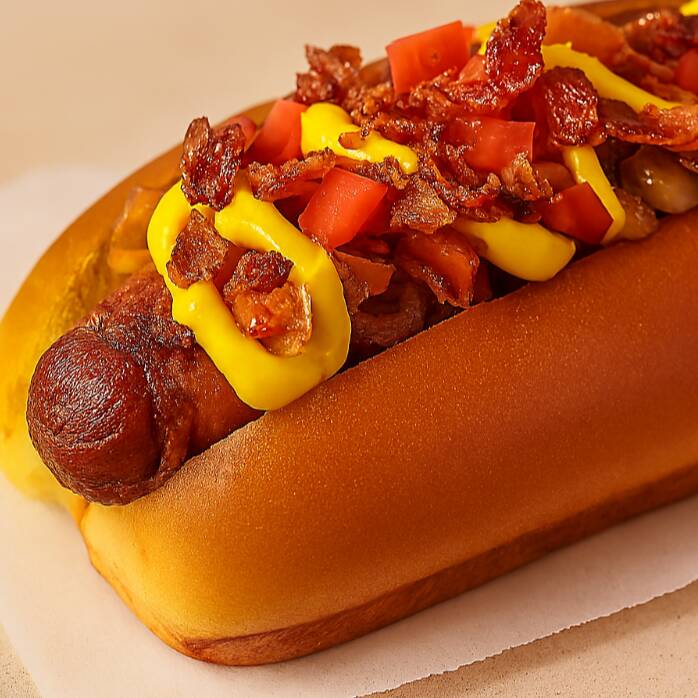 Hotdog con salchicha envuelta en tocino, y trozos de tocino arriba, cebolla caramelizada jitomate y mostaza en pan brioche