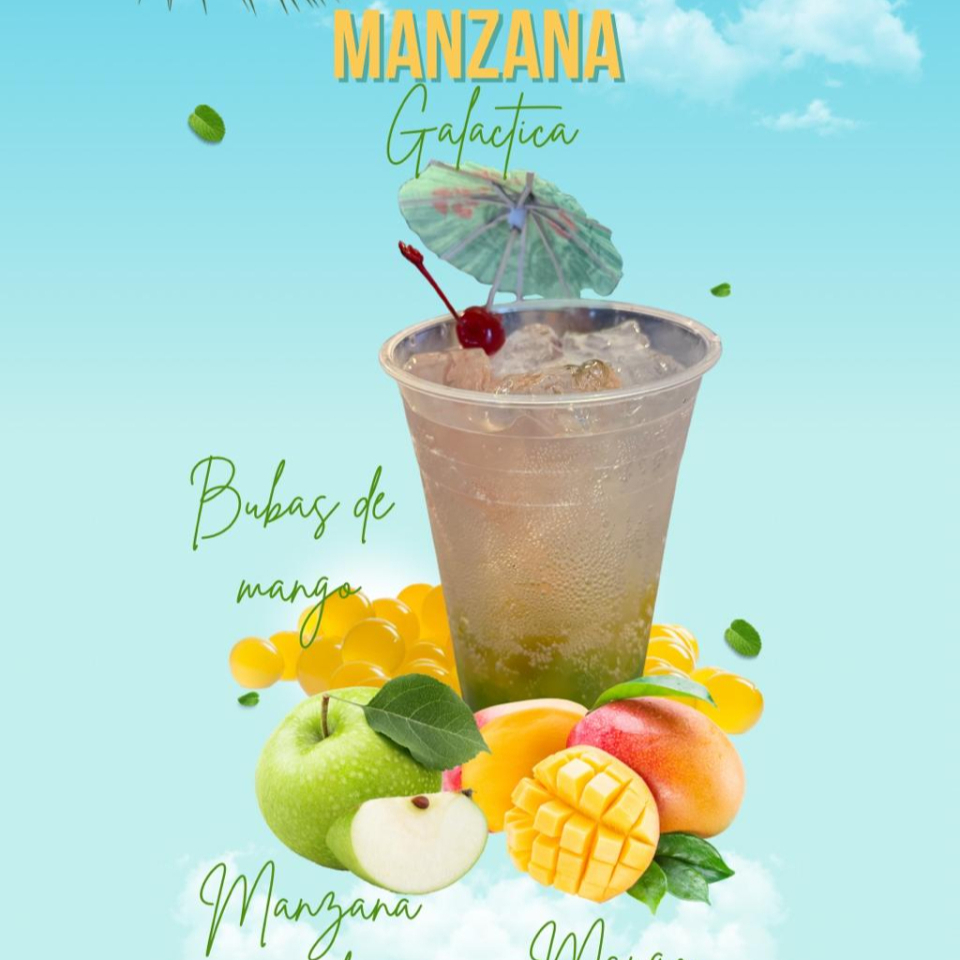 ¡Sabor de otro planeta! Una bebida brillante con jarabe de manzana verde, buba de mango, hielo, agua mineral y un toque de glitter comestible ✨ Refrescante, chispeante y totalmente galáctica.