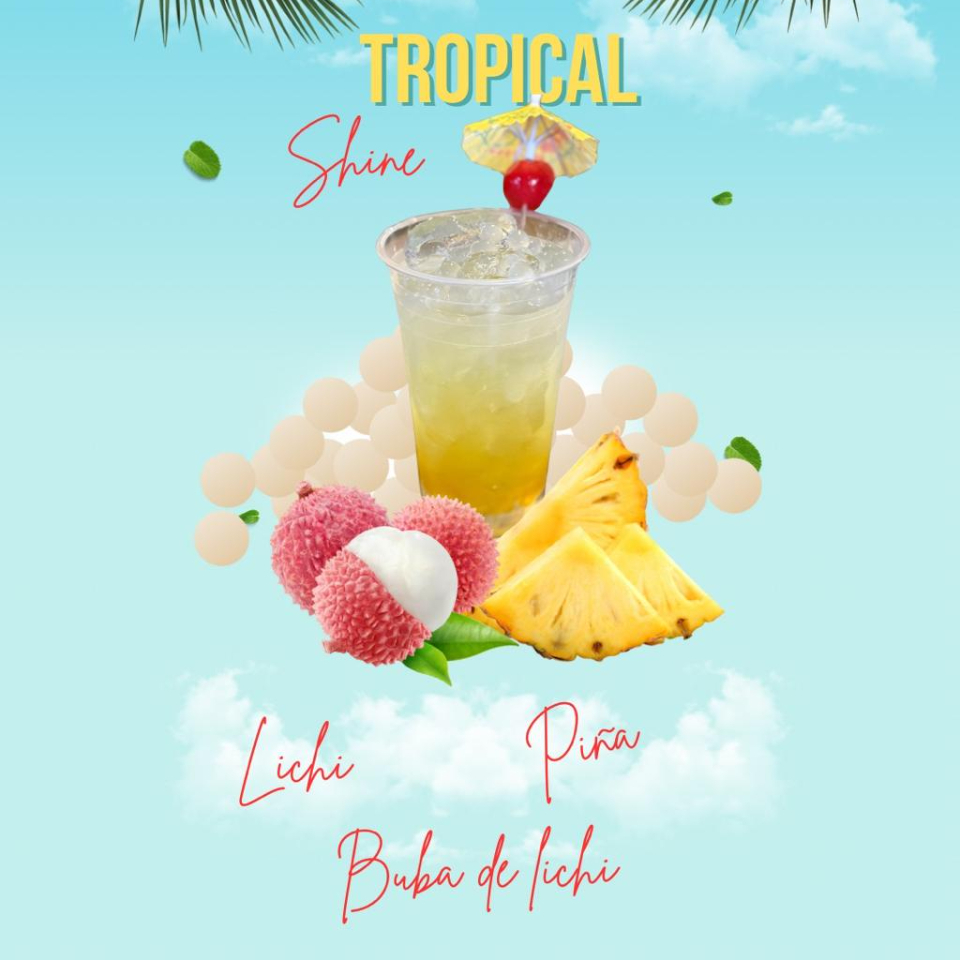 Refresca tu día con el brillo del trópico. Lichi jugoso, piña con glitter brillante, burbujas de lichi y agua mineral en una combinación chispeante que te hará sonreír desde el primer sorbo. ¡Pura vibra tropical!