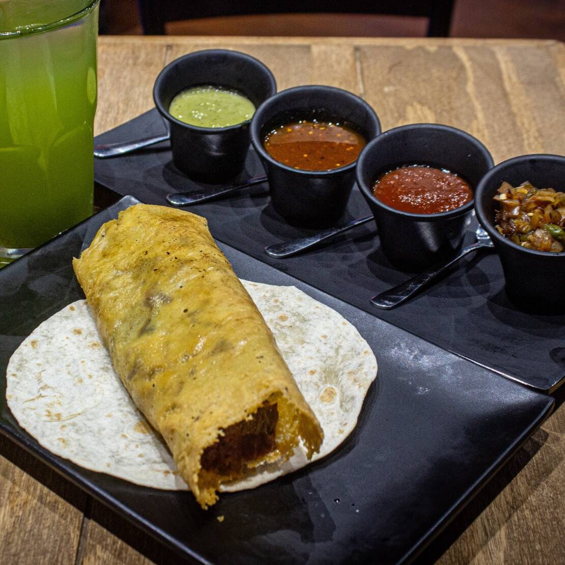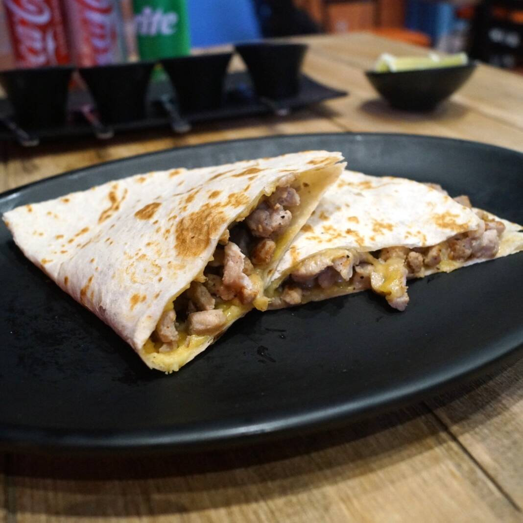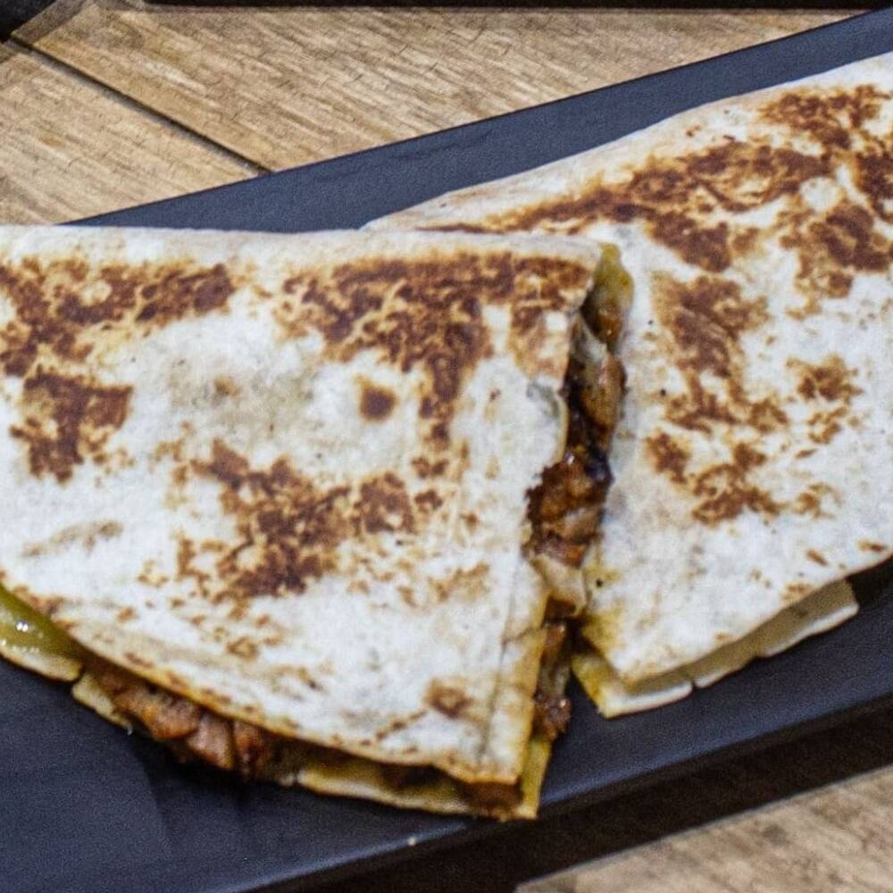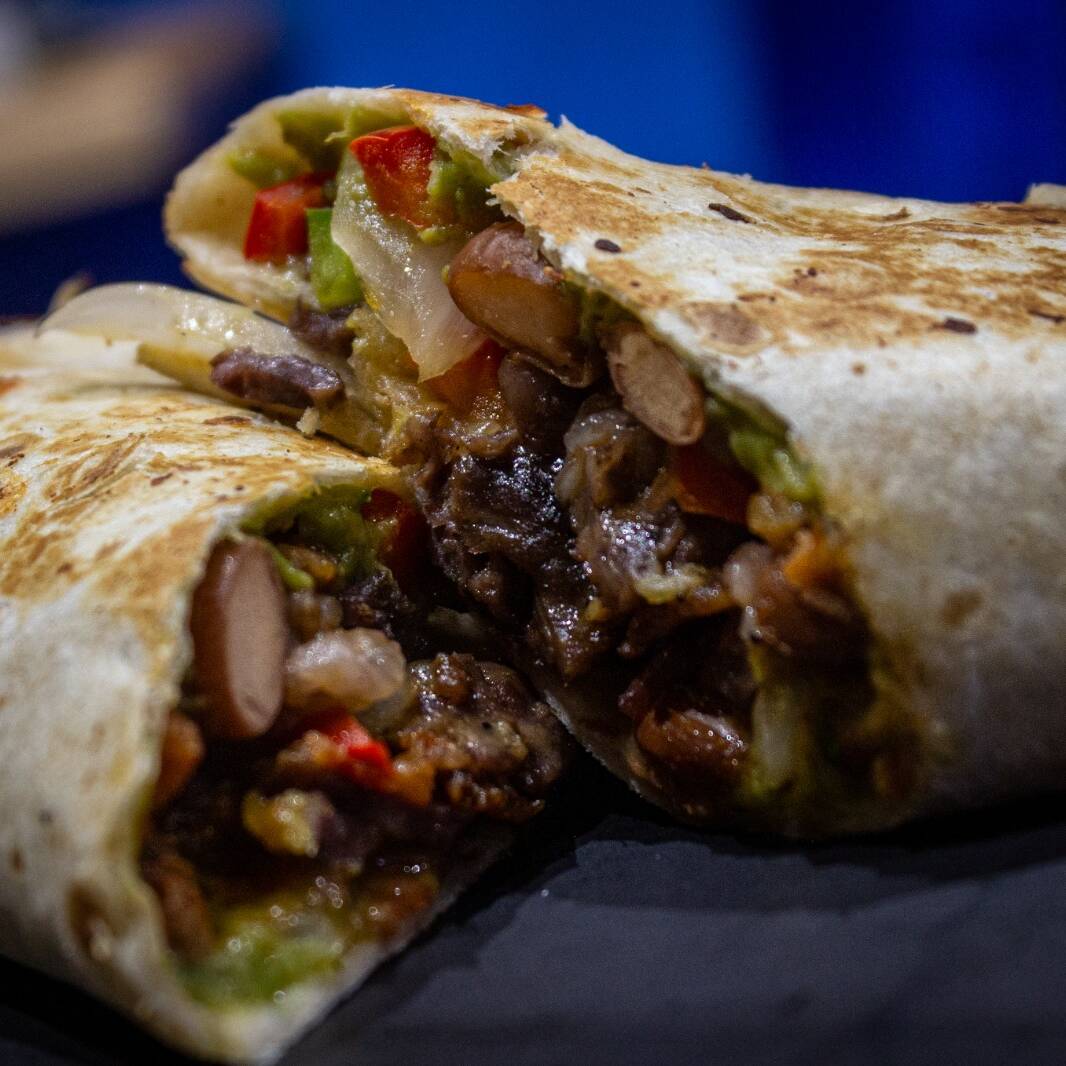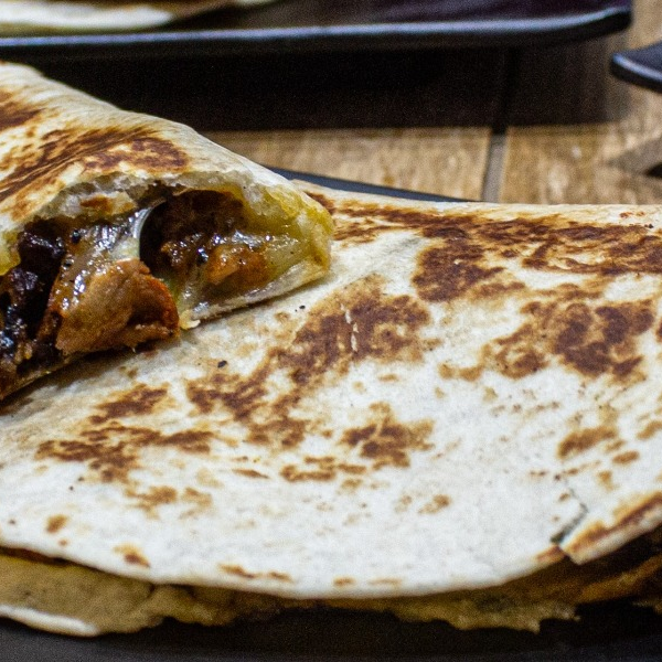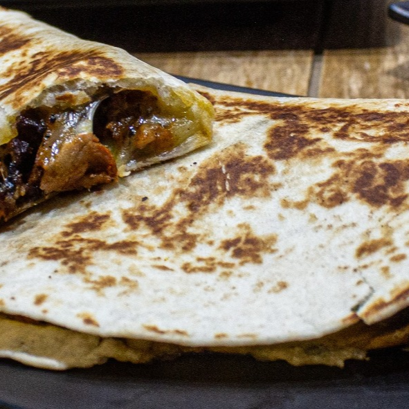 Una de nuestras especialidades, rica tortilla de harina gigante rellena de queso y sirloin de res importado, tienes que probarla