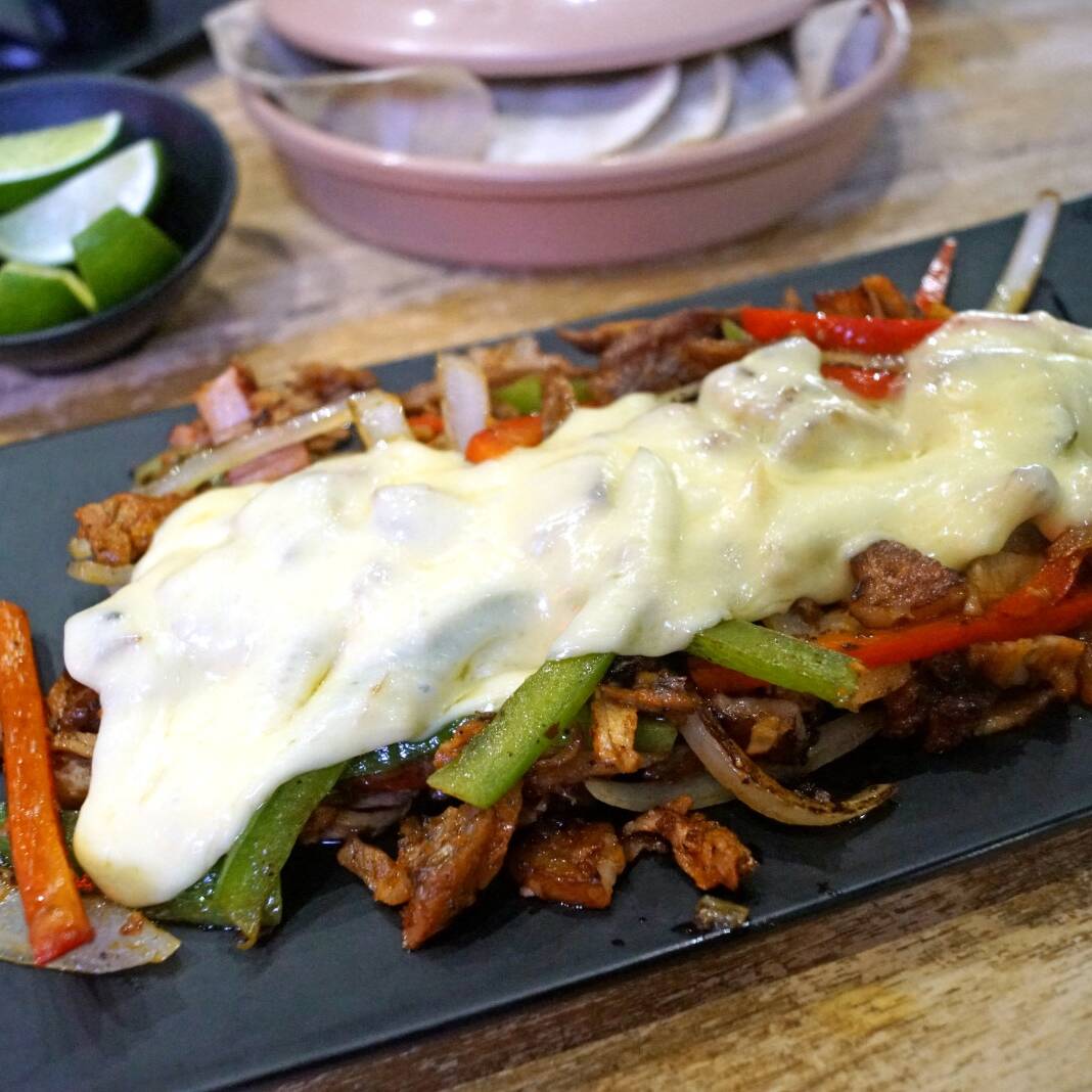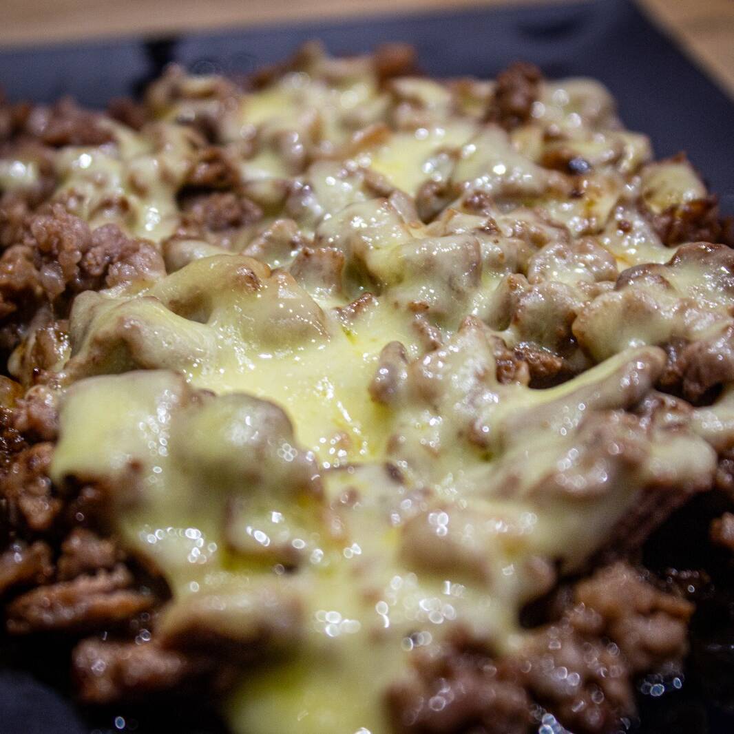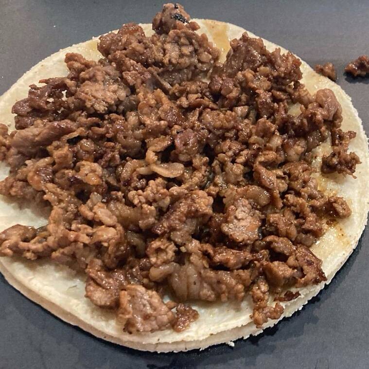 Rica costra de queso rellena de carne al pastor sobre una tortilla de harina