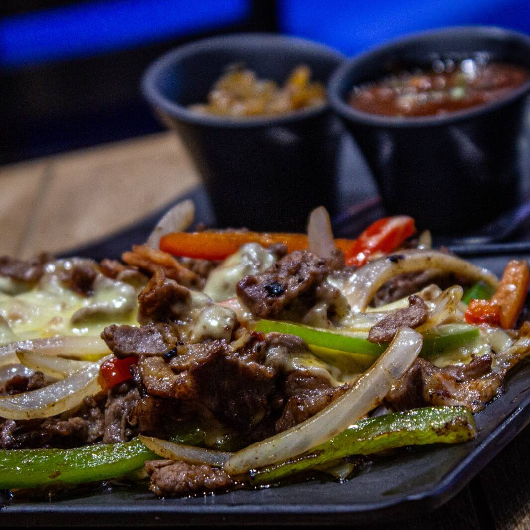 200 gr de bistec combinado con pimiento rojo y verde, tocino, cebolla y queso