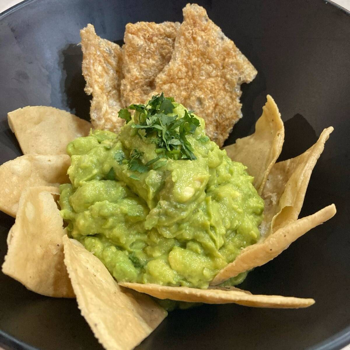 Complementa tu comida con el mejor sabor mexicano rico aguacate,cebolla,cilantro: 200 gramos de rico guacamole acompañado de chicharrón fresco y totopos