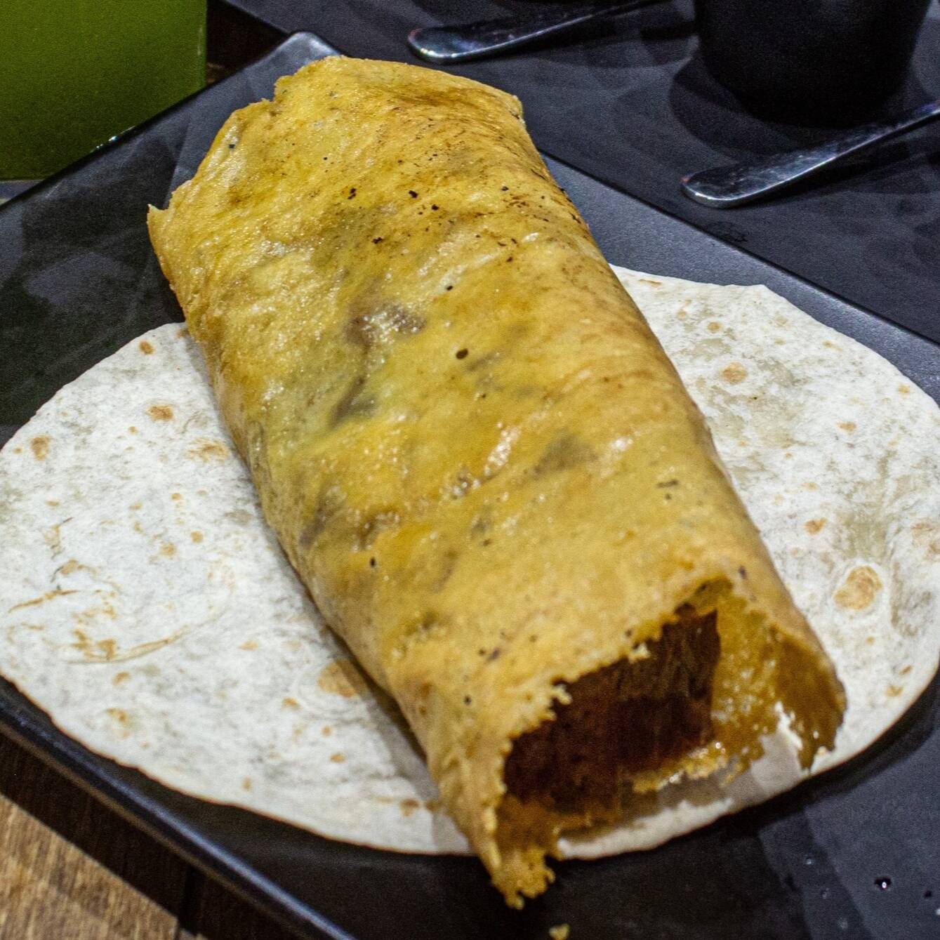 Guacamole, frijoles, carne al pastor, queso, pimientos, tocino y cebolla envueltos por una tortilla gigante (30 cm)