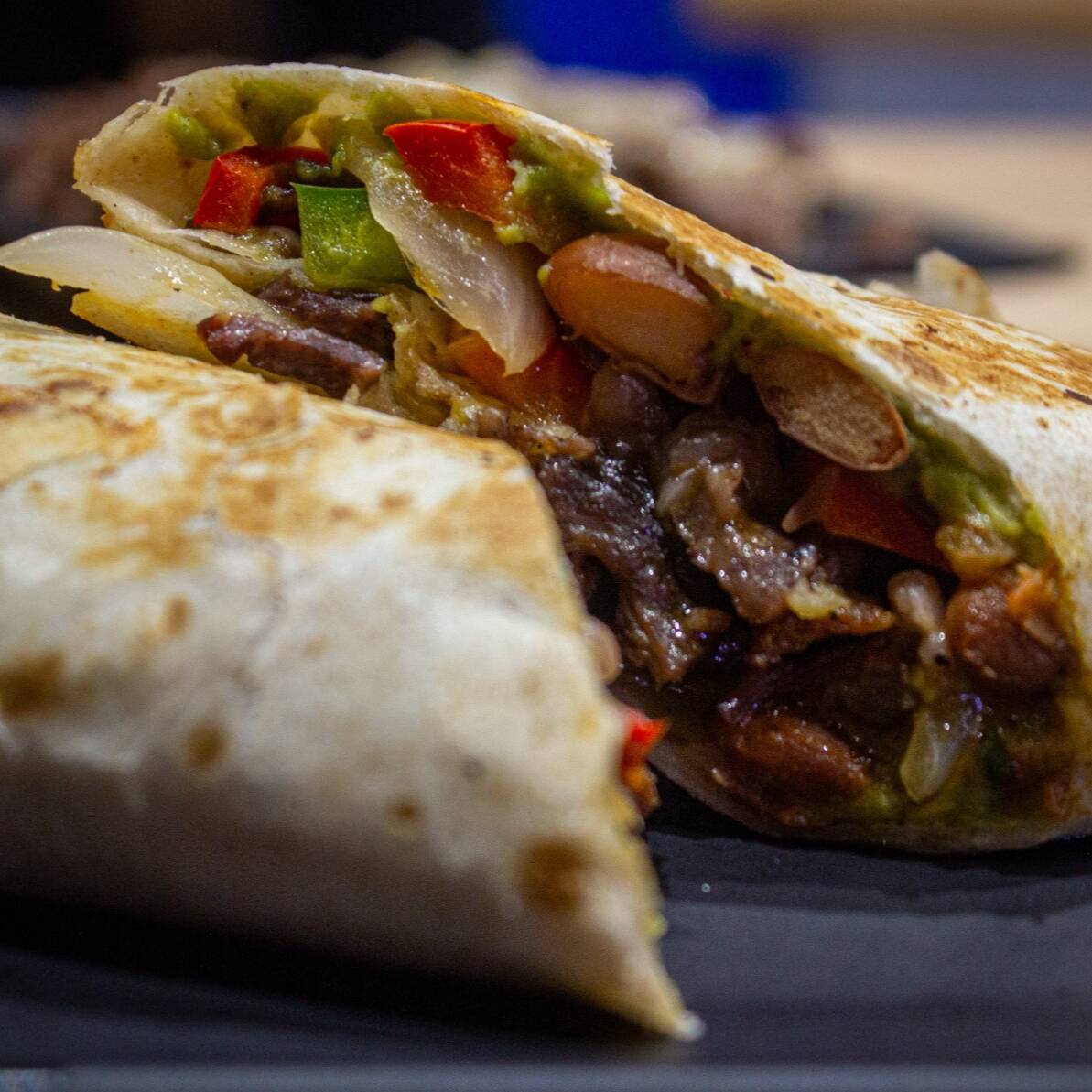 Guacamole, frijoles, sirloin importado, queso, pimientos, tocino y cebolla envueltos por una tortilla gigante (30 cm)