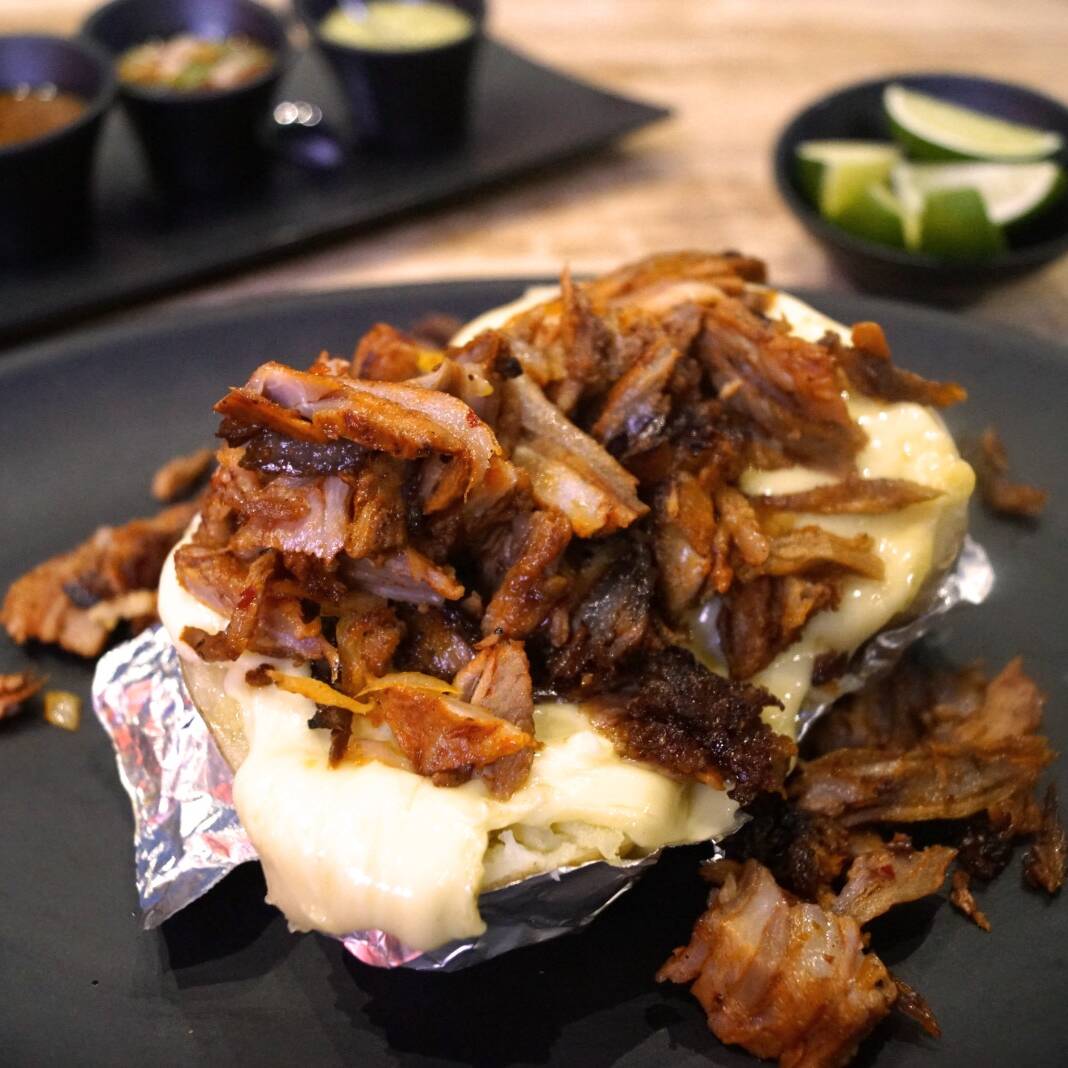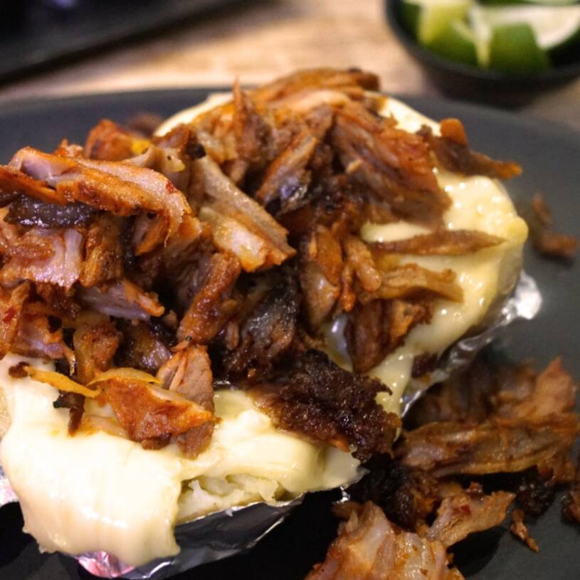 Rica papa sazonada con mantequilla, crema, queso gouda gratinado acompañada de 150 gr de nuestro rica carne al pastor y salsa aguacate habanero