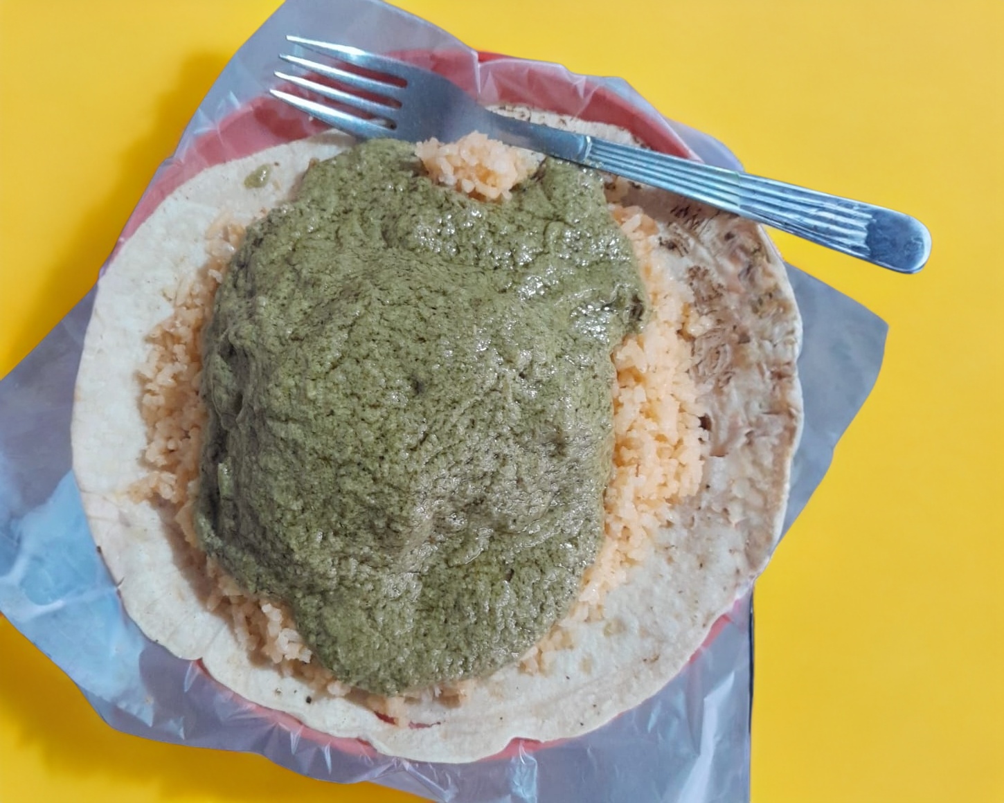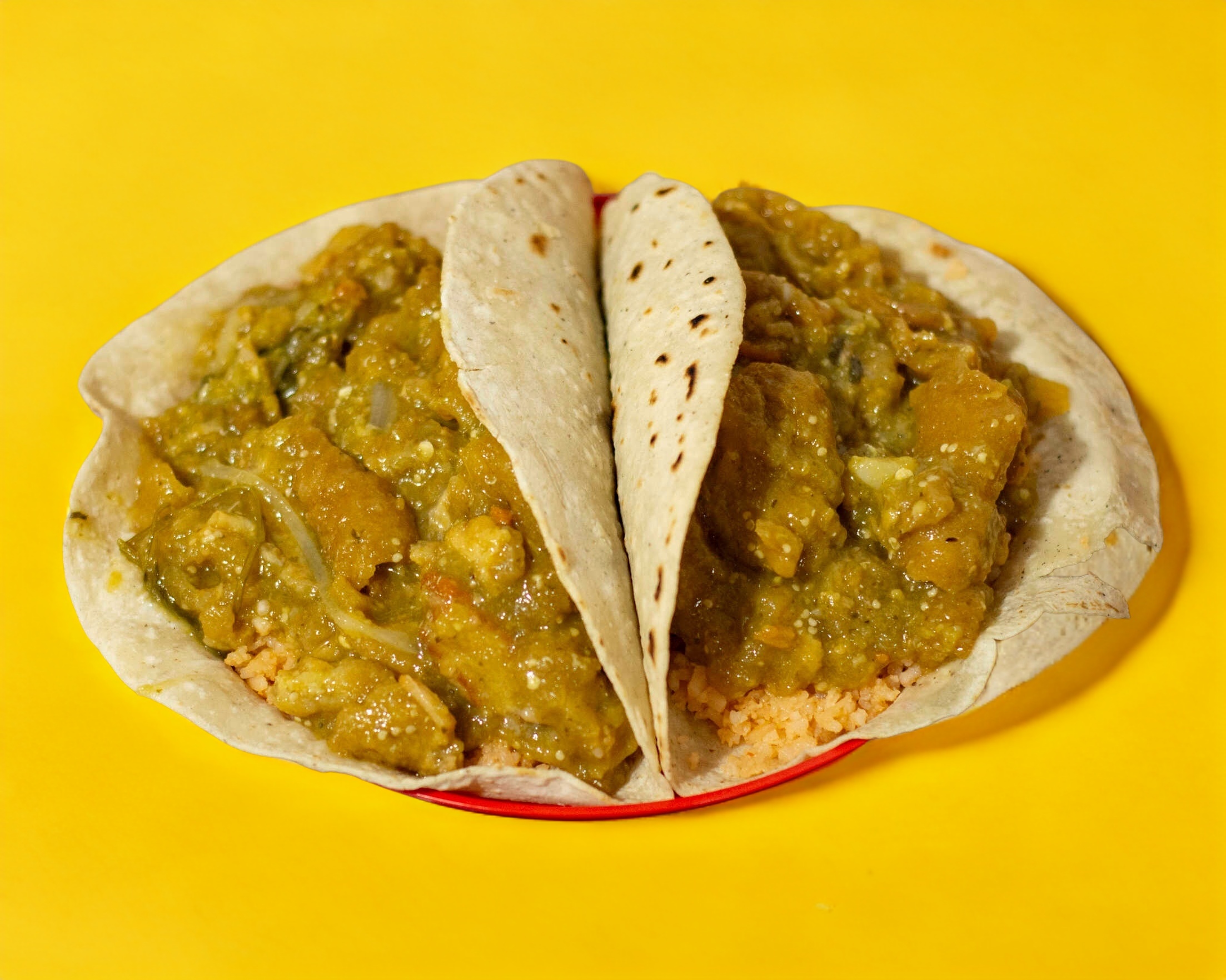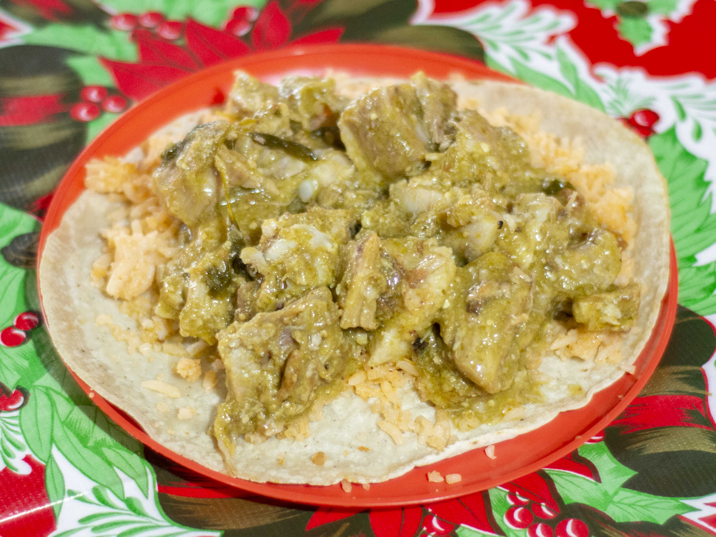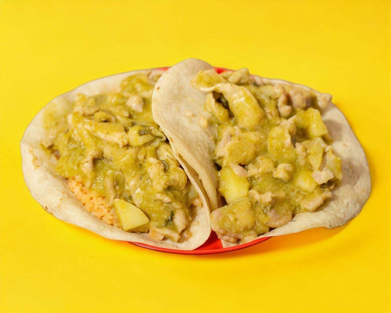 2 Tortillas Echas a Mano, Con Arroz y Trocitos de Costilla De Cerdo en Salsa Verde