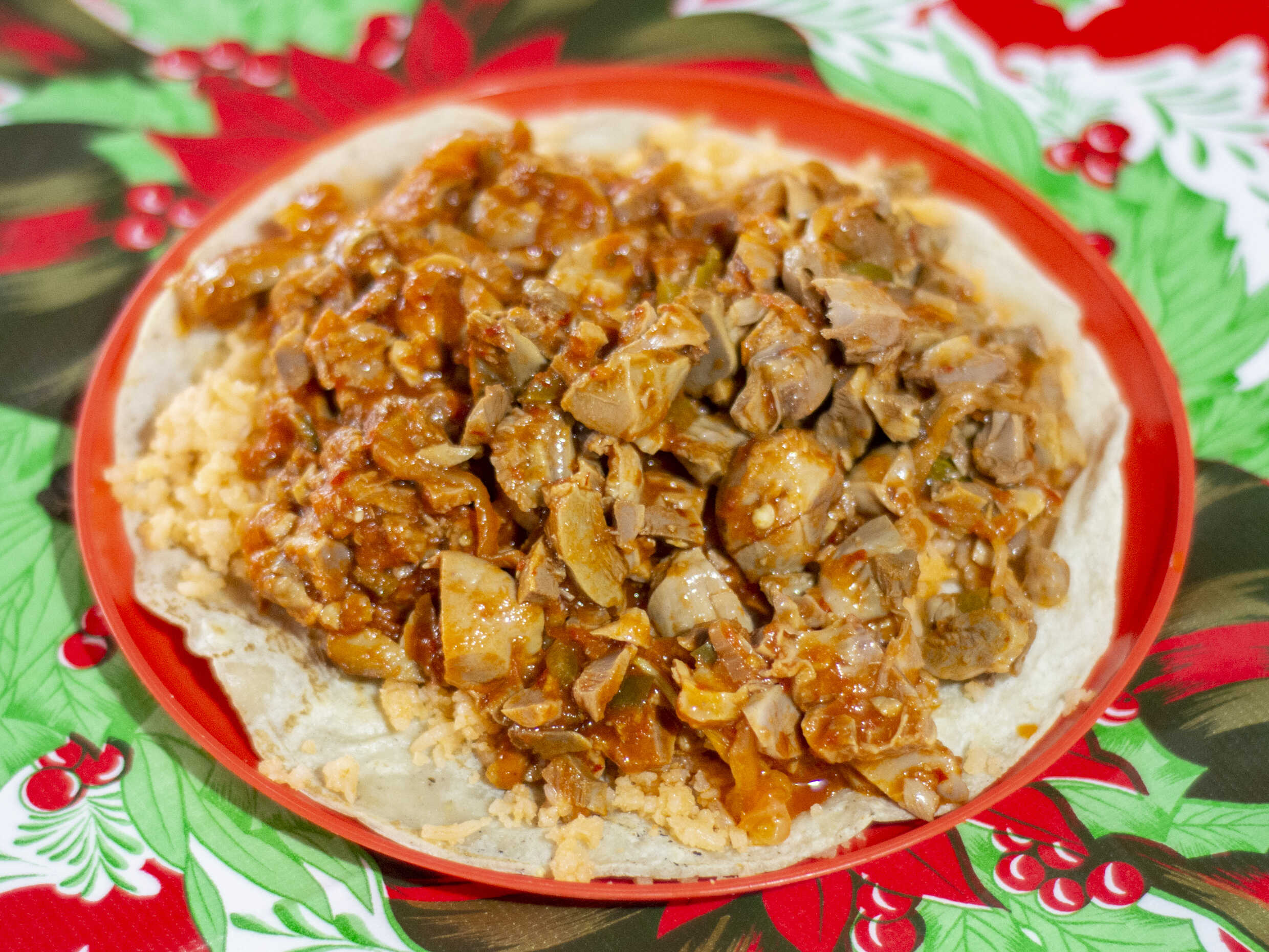 Fajitas de pechuga de polllo con pimiento morrón, papas y cebolla