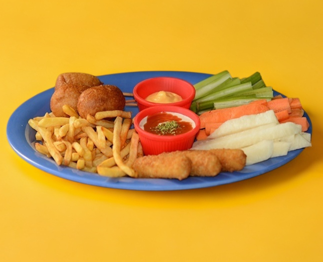 MIX DE NUESTRAS MEJORES ENTRADAS. 125GR DE PAPAS A LA FRANCESA, 3 PALITOS DE QUESO, 3 MINI BANDERILLAS, APIO, ZANAHORIA Y JÍCAMA CORTADOS EN BASTONES. CON UN CUP DE SALSA PARA LOS PALITOS DE QUESO Y QUESO LIQUIDO.