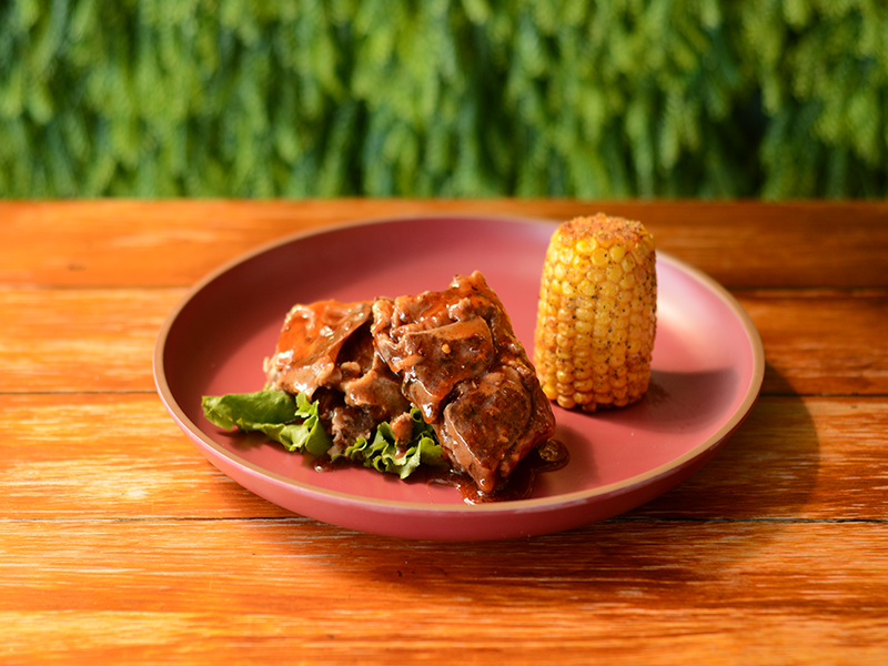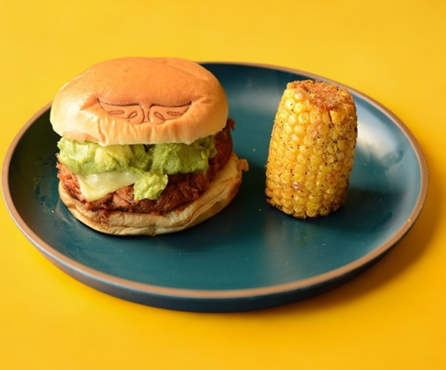 HAMBURGUESA DE COSTILLA DE CERDO A LA BBQ, PERFECTAMENTE RETIRADA DEL HUESO, CON AGUACATE MACHACADO Y SAZONADO CORONANDO CON QUESO MANCHEGO DERRETIDO. TODO ENTRE DOS REBANADAS DE PAN BRIOCHE ACOMPAÑADO DE MEDIO ELOTE DULCE FRITO.