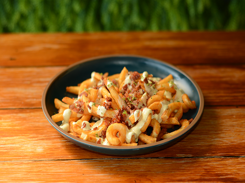 250 GR DE PAPAS CURLY BAÑADAS EN NUESTRAS SALSA ACIDA ESPECIAL, ACOMPAÑADAS DE TOCINO FRITO EN TROZOS Y ADORNADA CON BROTES DE BRÓCOLI DELICIOSAS UNA DE NUESTRAS ESPECIALIDADES.