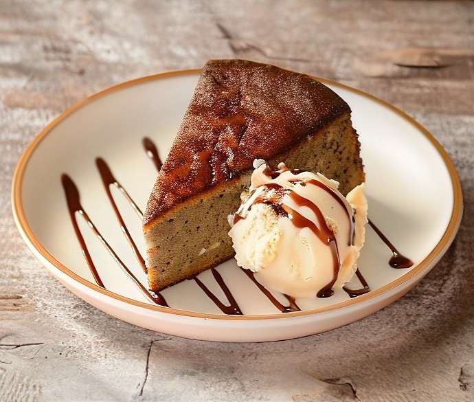 NUESTRO FAMOSO PASTEL DE PLATO HECHO EN CASA, SÚPER ESPONJOSO. ACOMPAÑADO DE UNA BOLA DE HELADO DE VAINILLA.