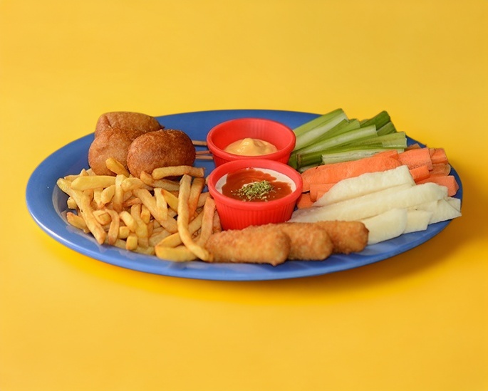 MIX DE NUESTRAS MEJORES ENTRADAS. 125GR DE PAPAS A LA FRANCESA, 3 PALITOS DE QUESO, 3 MINI BANDERILLAS, APIO, ZANAHORIA Y JÍCAMA CORTADOS EN BASTONES. CON UN CUP DE SALSA PARA LOS PALITOS DE QUESO Y QUESO LIQUIDO.