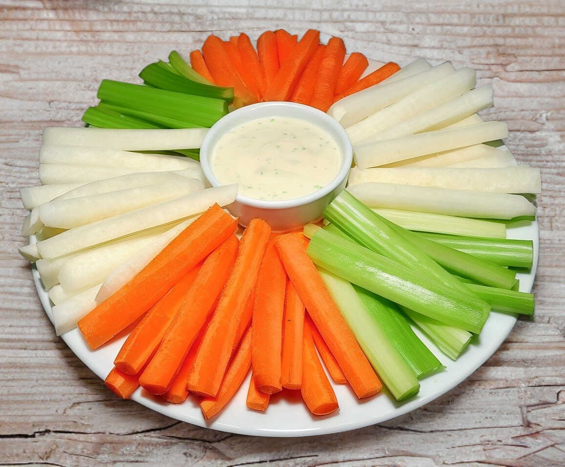 BASTONES DE VEGETALES FRESCOS COMO ZANAHORIA, JÍCAMA, APIO Y JITOMATE CHERRY. SE ACOMPAÑA CON NUESTRO DELICIOSO CHAMOY.
