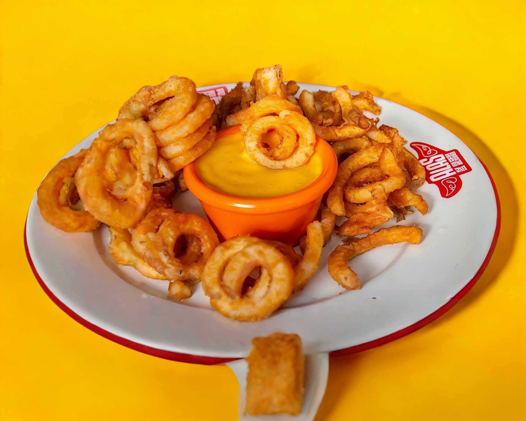 230 GR DE PAPAS CURLY SÚPER CRUJIENTES, LISTAS PARA QUE TE EXPLOTE LA CABEZA, INCLUYEN QUESO LIQUIDO.