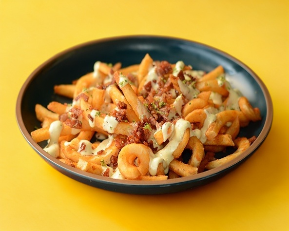 250 GR DE PAPAS CURLY BAÑADAS EN NUESTRAS SALSA ACIDA ESPECIAL, ACOMPAÑADAS DE TOCINO FRITO EN TROZOS Y ADORNADA CON BROTES DE BRÓCOLI DELICIOSAS UNA DE NUESTRAS ESPECIALIDADES.