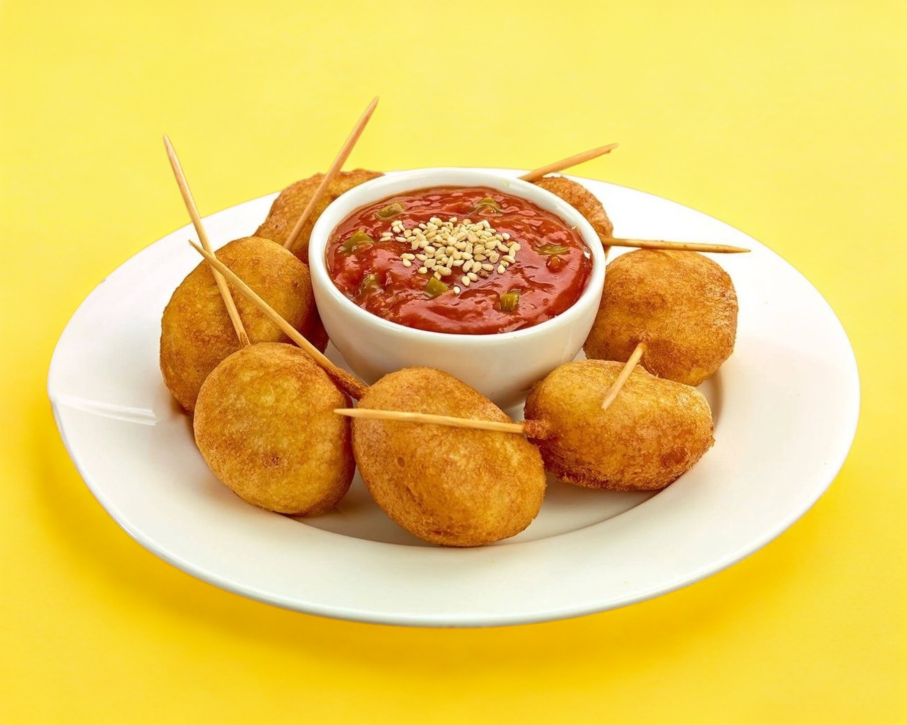 BANDERILLAS DE SALCHICHA REBOSADAS EN NUESTRO MASA ESPECIAL SÚPER ESPONJOSAS. CON PAPAS A LA FRANCESA