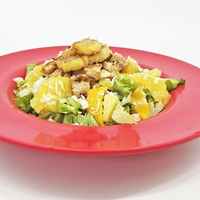 Lechuga, jícama, mango, piña en almíbar cocida a la plancha, coco rallado y supremas de naranja. Puedes escoger una de estas dos proteínas 100 gr de pechuga de pollo a la plancha o atún e incluye aderezo Ranch o vinagreta de frambuesa