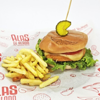 Pan bagel, mayonesa, pollo estilo crunchy, queso manchego, lechuga, jitomate, cebolla morada, pepinillos, jalapeños y acompañada de papas a la francesa.