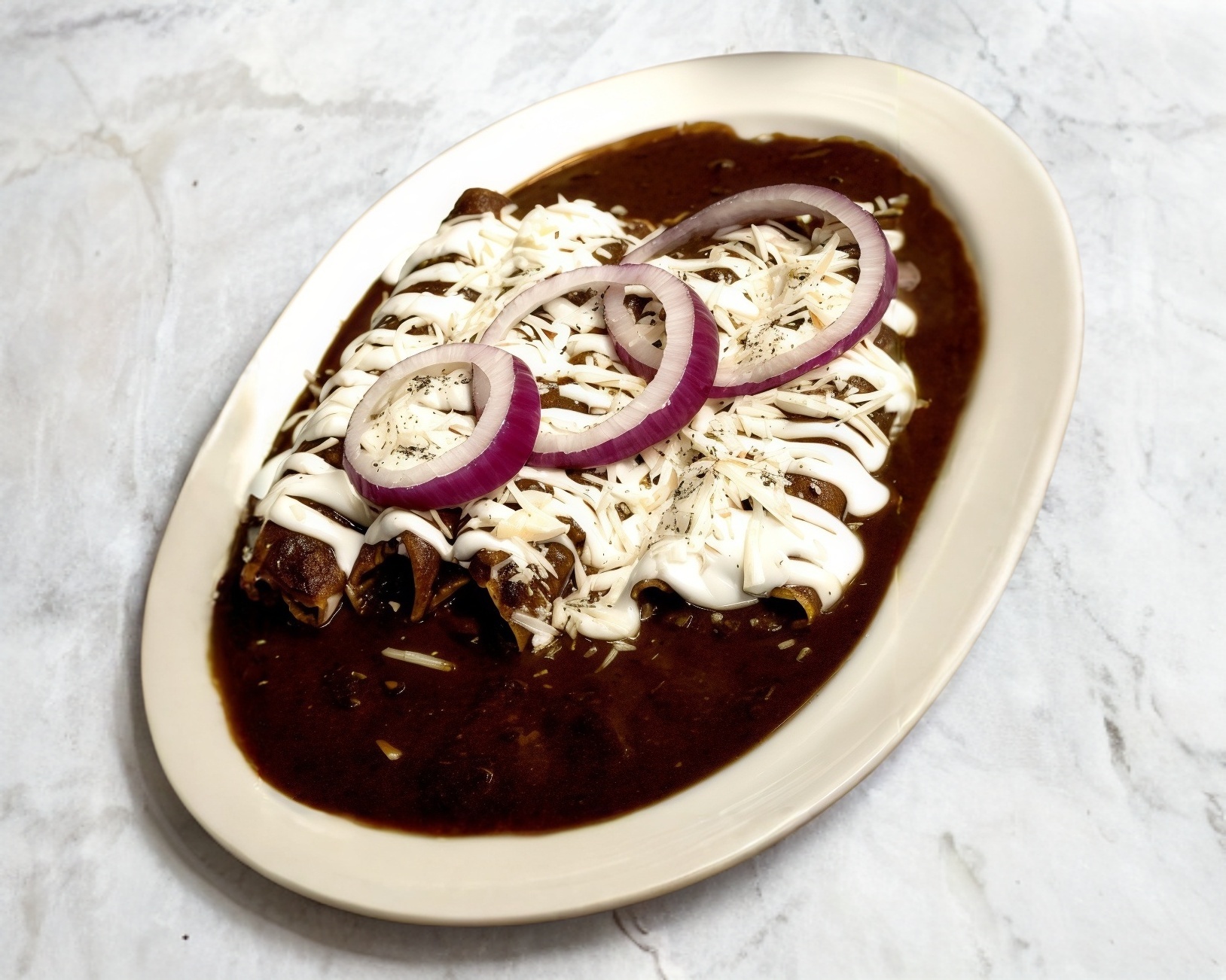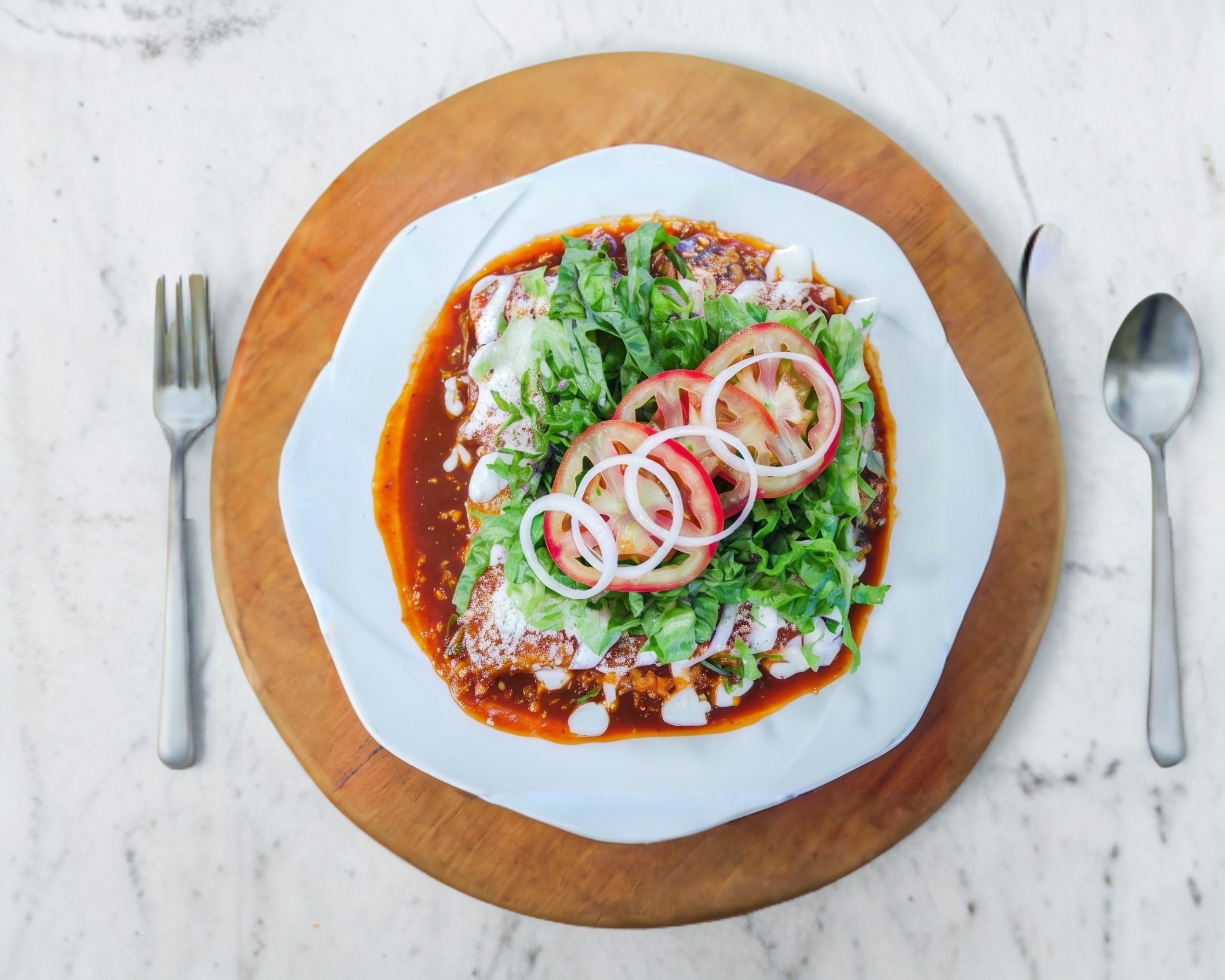 4 tortillas rellenas de requesón, bañadas en un rico adobo de 3 chiles, decoradas con lechuga, jitomate y cebolla.