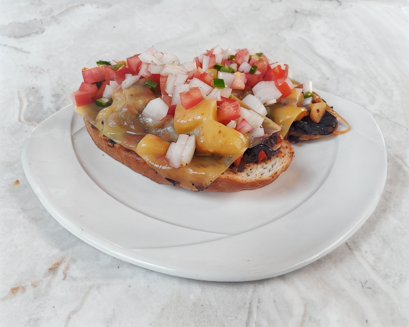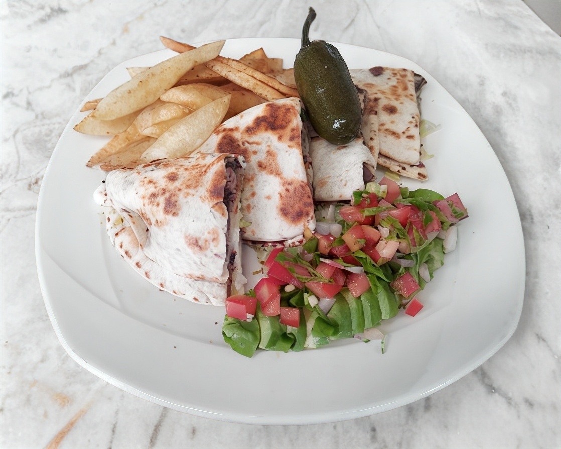Sincronizada rellena de bistec de res, cebolla caramelizada, frijoles, queso y un poco de lechuga. Acompañado con papas fritas y pico de gallo.