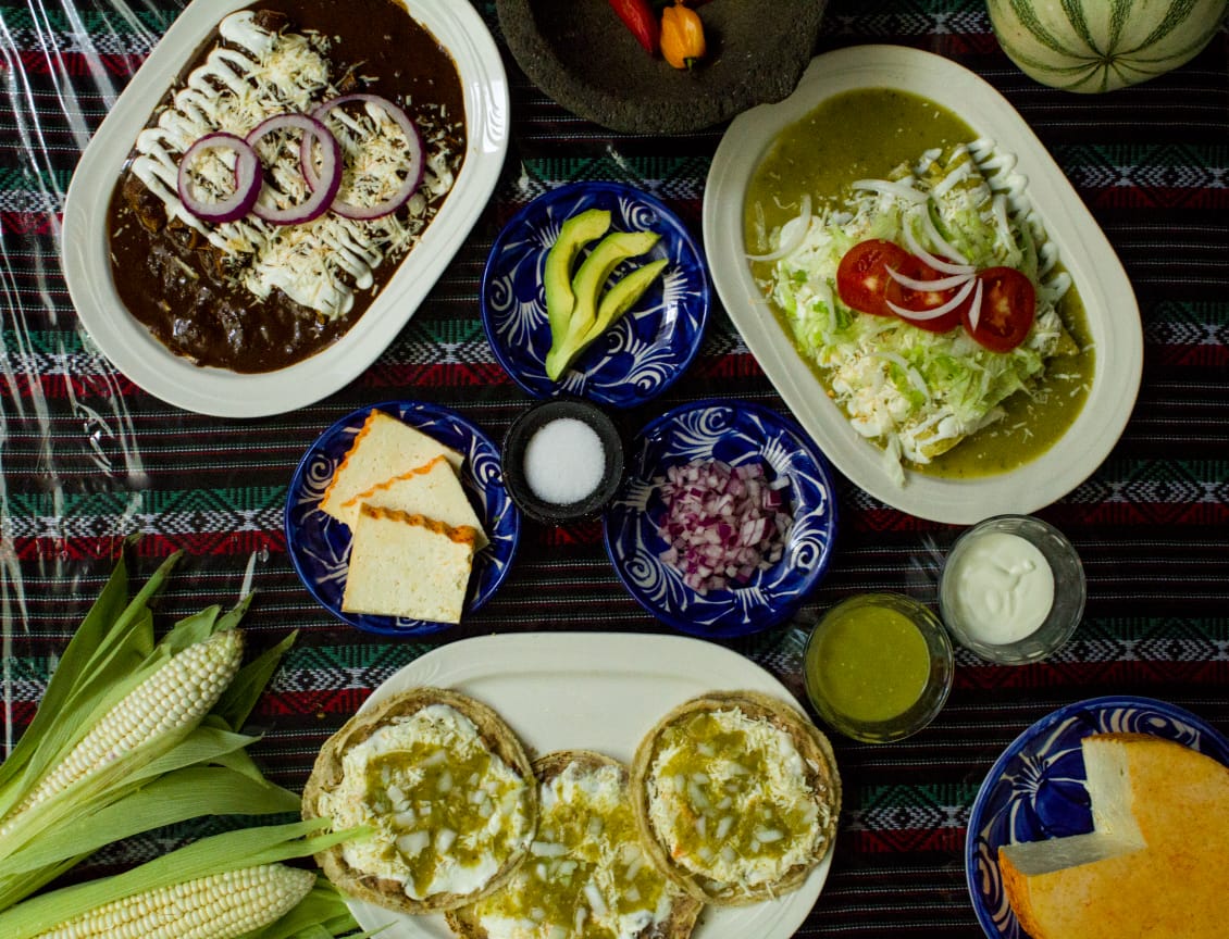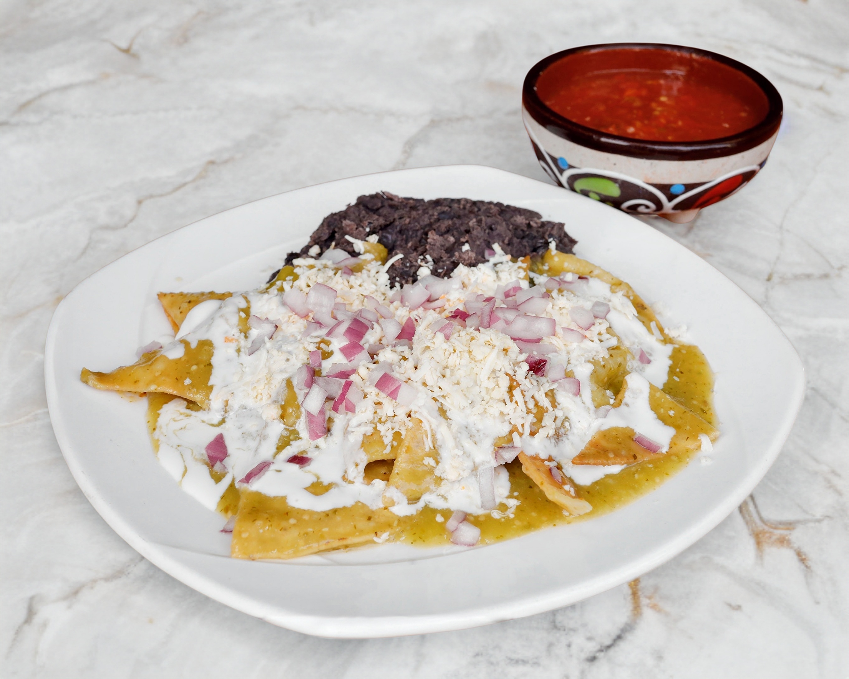 Totopos ahogados en salsa verde o roja con crema, queso, cebolla y frijoles refritos.