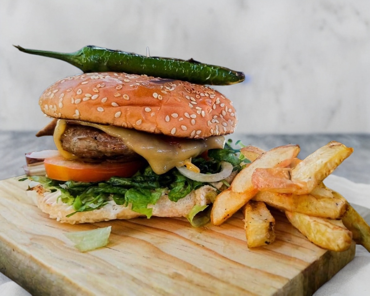 Carne de res con tocino, queso manchego, lechuga, jitomate, cebolla y pepinillos. Acompañada con una guarnicion de papas fritas y chile toreado.