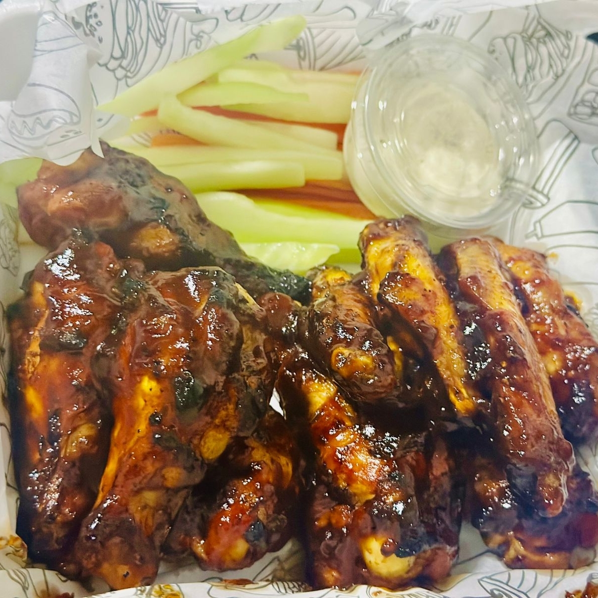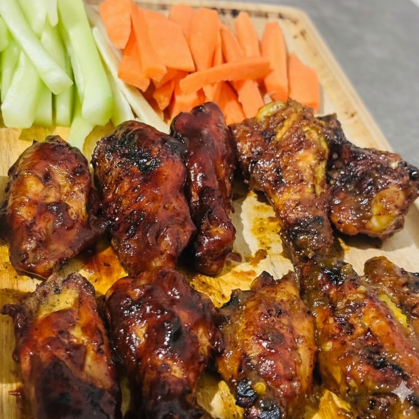 Alitas al carbón bañadas de tu salsa preferida acompañadas de palitos de zanahoria y pepinos