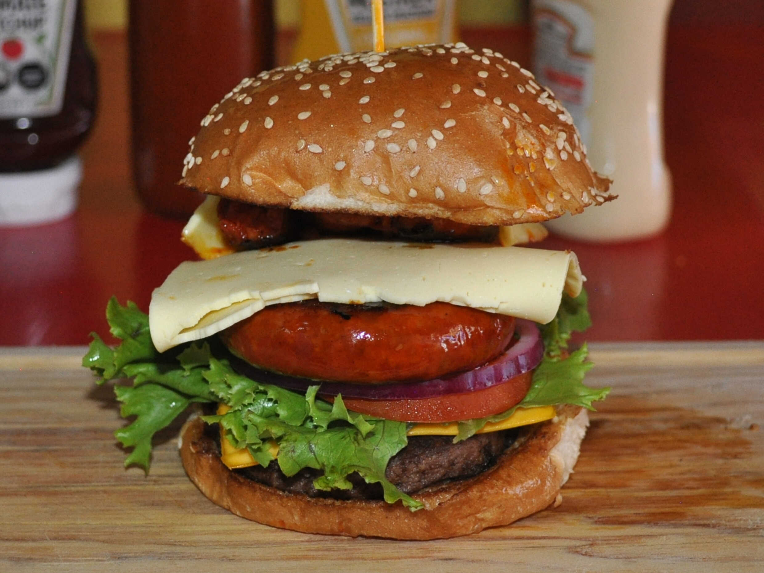 carne de res de 90 gramos, tocino queso amarillo, lechuga jitomate cebolla chiles .