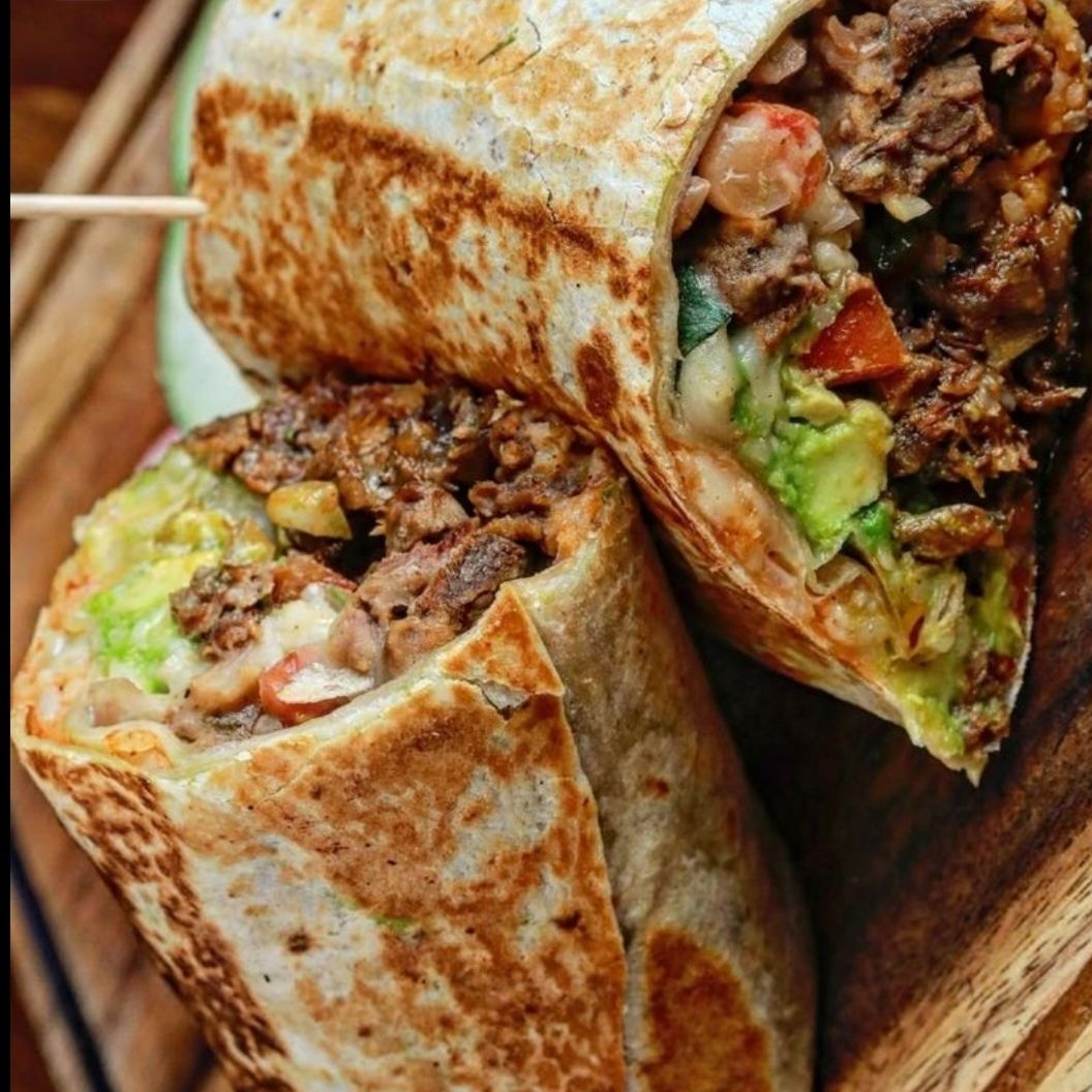 Tortilla de harina, birria de rez, arroz mexicano, aguacate, queso manchego derritido, cilantro, cebolla, limon, pepino, rabano, salsas del dia