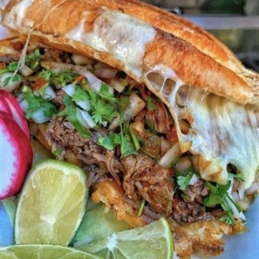 Pan telera, birria de rez,queso manchego derritido, mayonesa, cebolla, aguacate, cilantro, cebolla, pepino, rabano, limon, salsas del dia, incluye consome chico