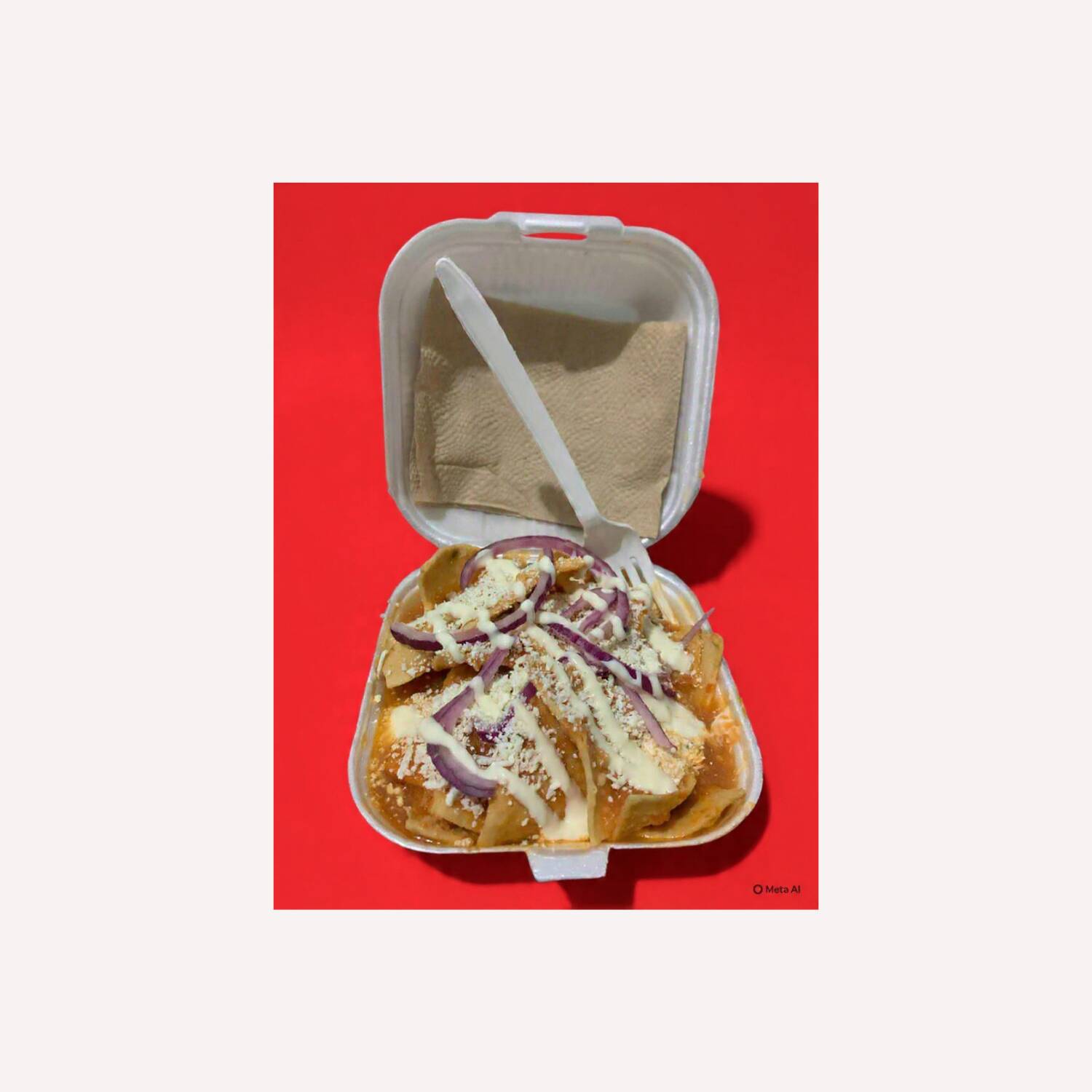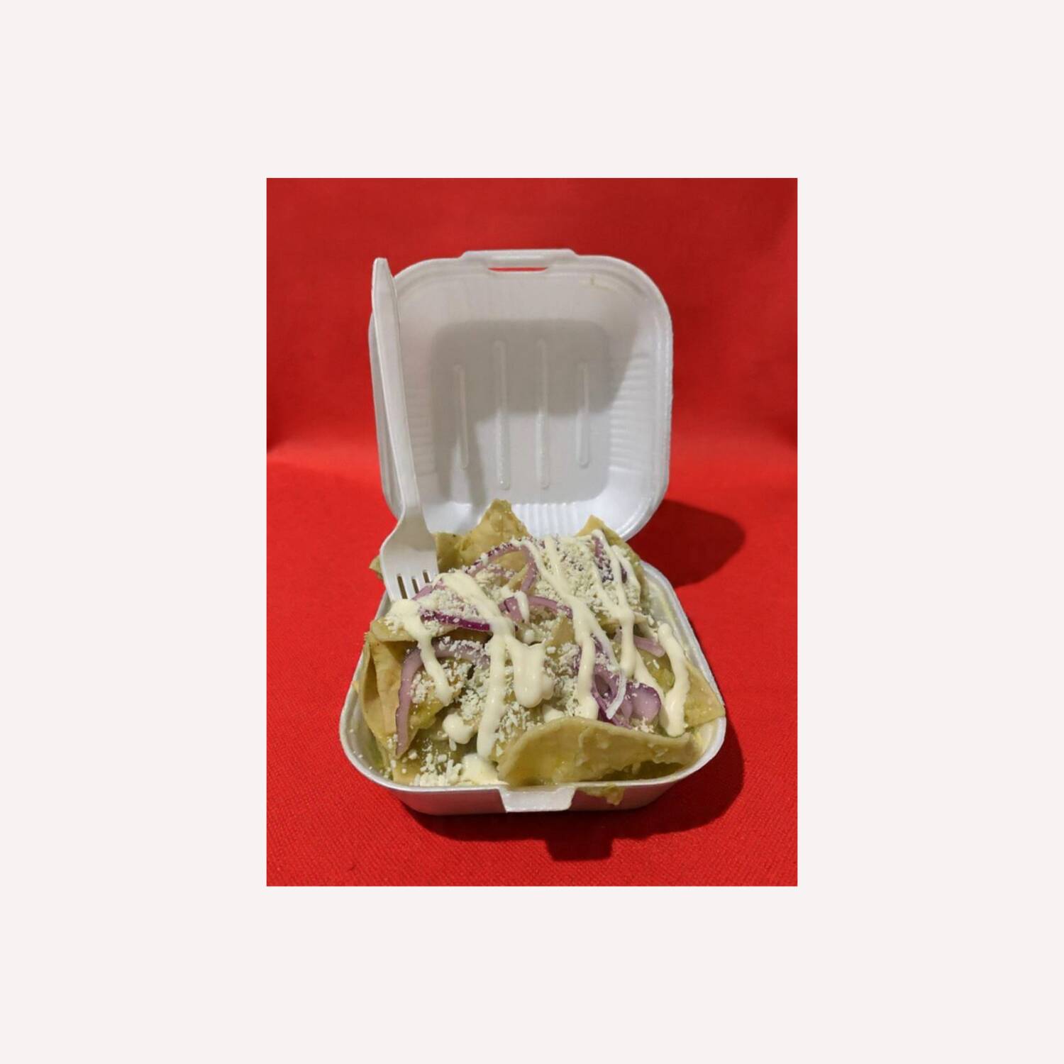 Totopos de maiz, salsa roja, cebolla, queso y crema.