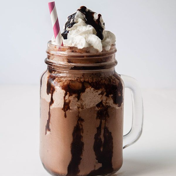 Delicioso frappé brownie, topping de crema y brownie.