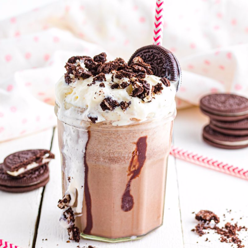 Delicioso frappé oreo, topping de crema y galleta oreo.