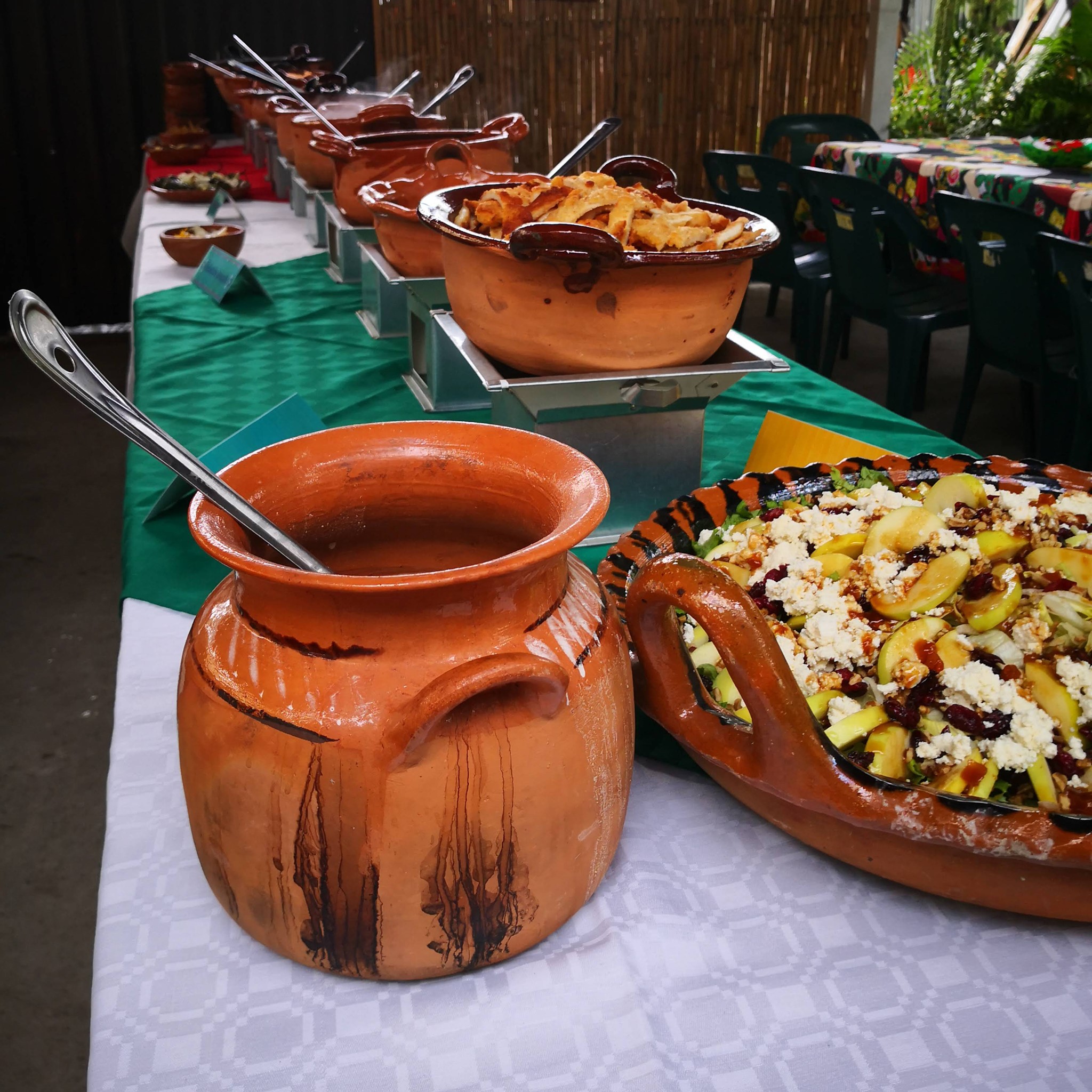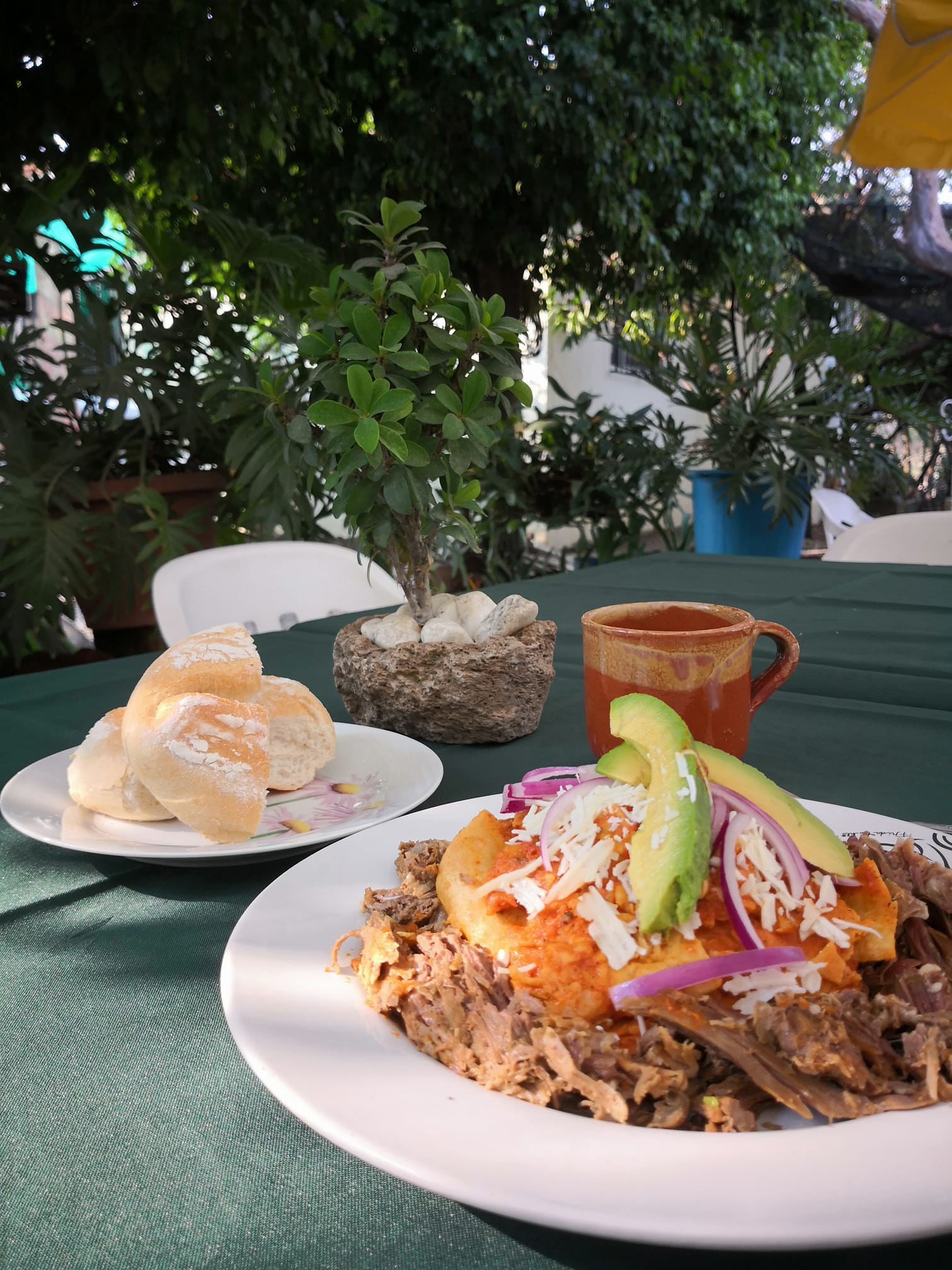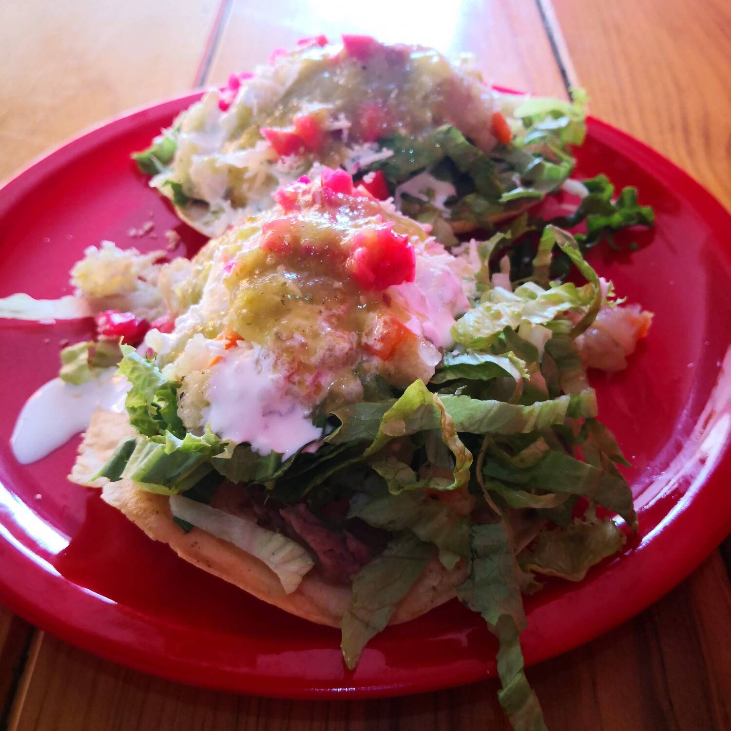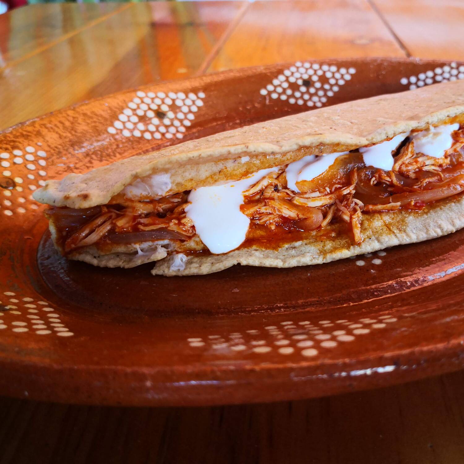 Huarache relleno de frijol con tinga de pollo, crema y queso. Salsa verde, salsa roja.