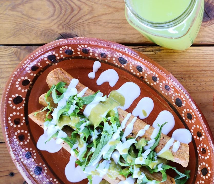 Flautas de tortilla de maíz, rellenas con barbacoa. Salsa verde, salsa roja.