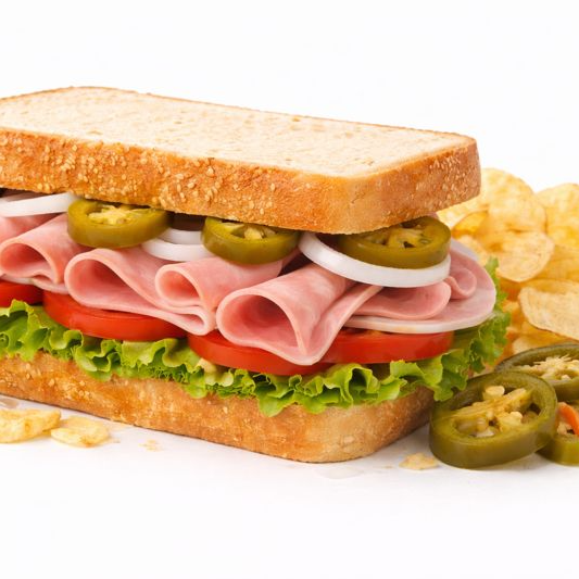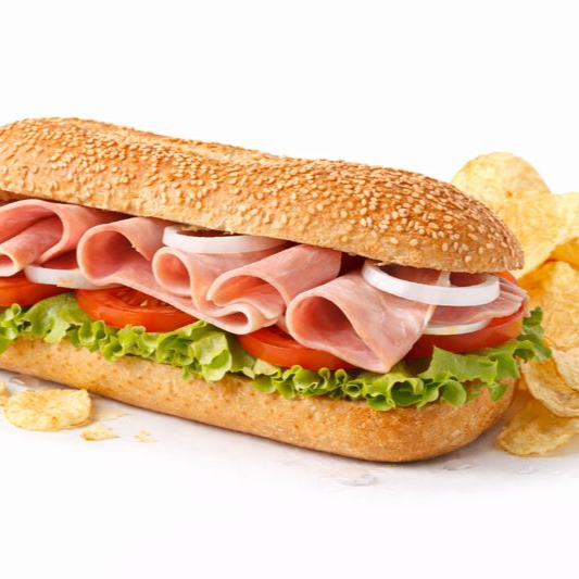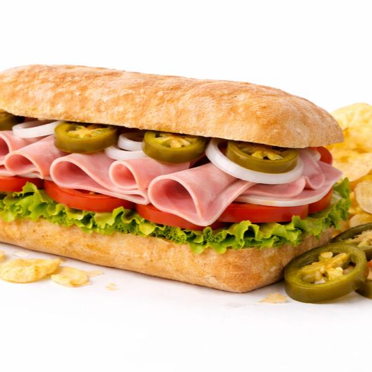 Deliciosa Baguette de jamón de pavo o pierna acompañada con papas y un aderezo especial de mayonesa chipotle