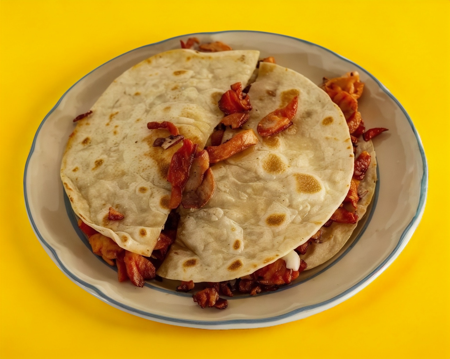 Pastor, queso, cebolla, cilantro, piña, tortillas de harina, dos tortillas de harina con queso, pastor, cebolla, cilantro, piña, tres tortillas de harina encima en ese orden.