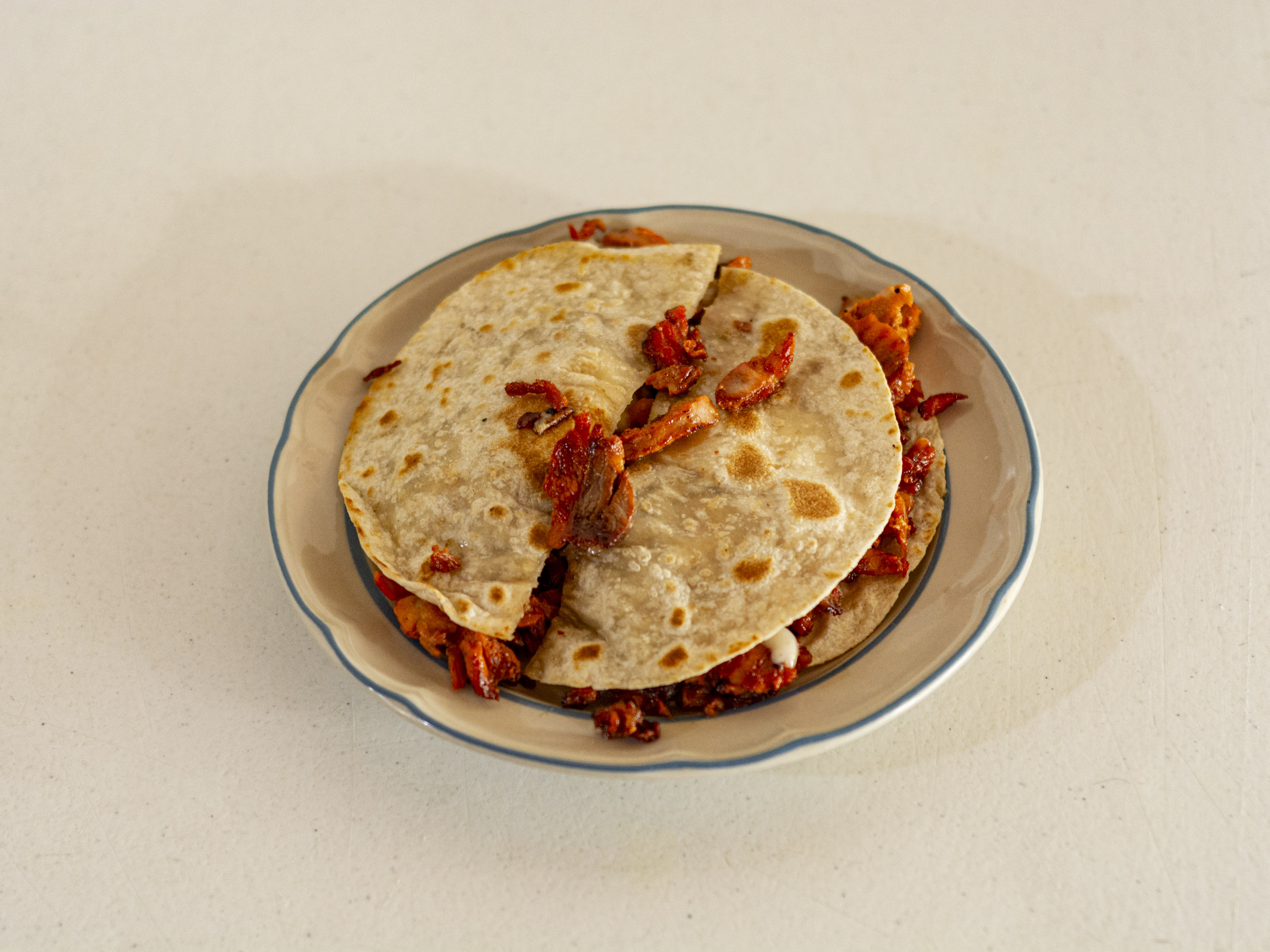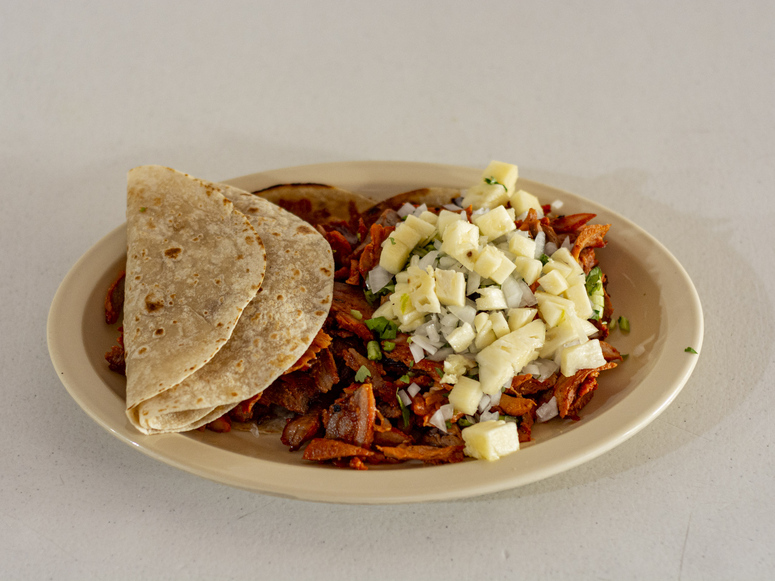 Pastor, queso, cebolla, cilantro, piña, tortillas de harina, dos tortillas de harina con queso, pastor, cebolla, cilantro, piña, tres tortillas de harina encima en ese orden.