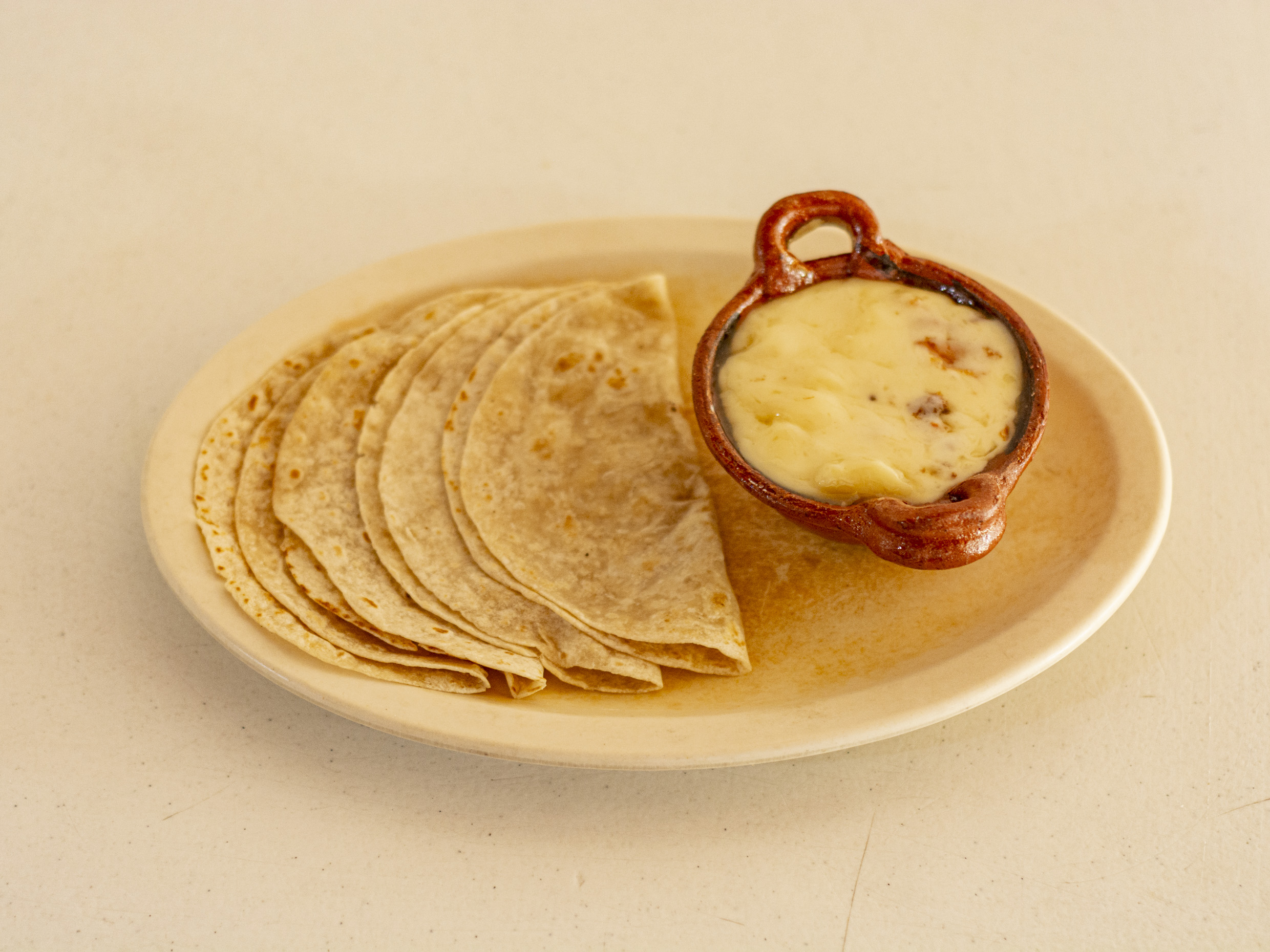 Queso fundido con chorizo, con 4 tortillas de harina.