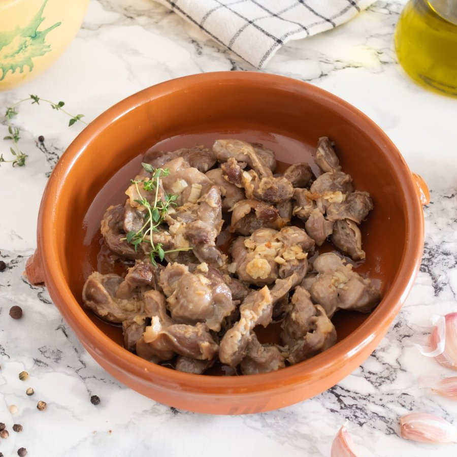 Mollejitas de pollo preparadas con cebolla y zanahoria, con limoncito, sal y salsa Valentina