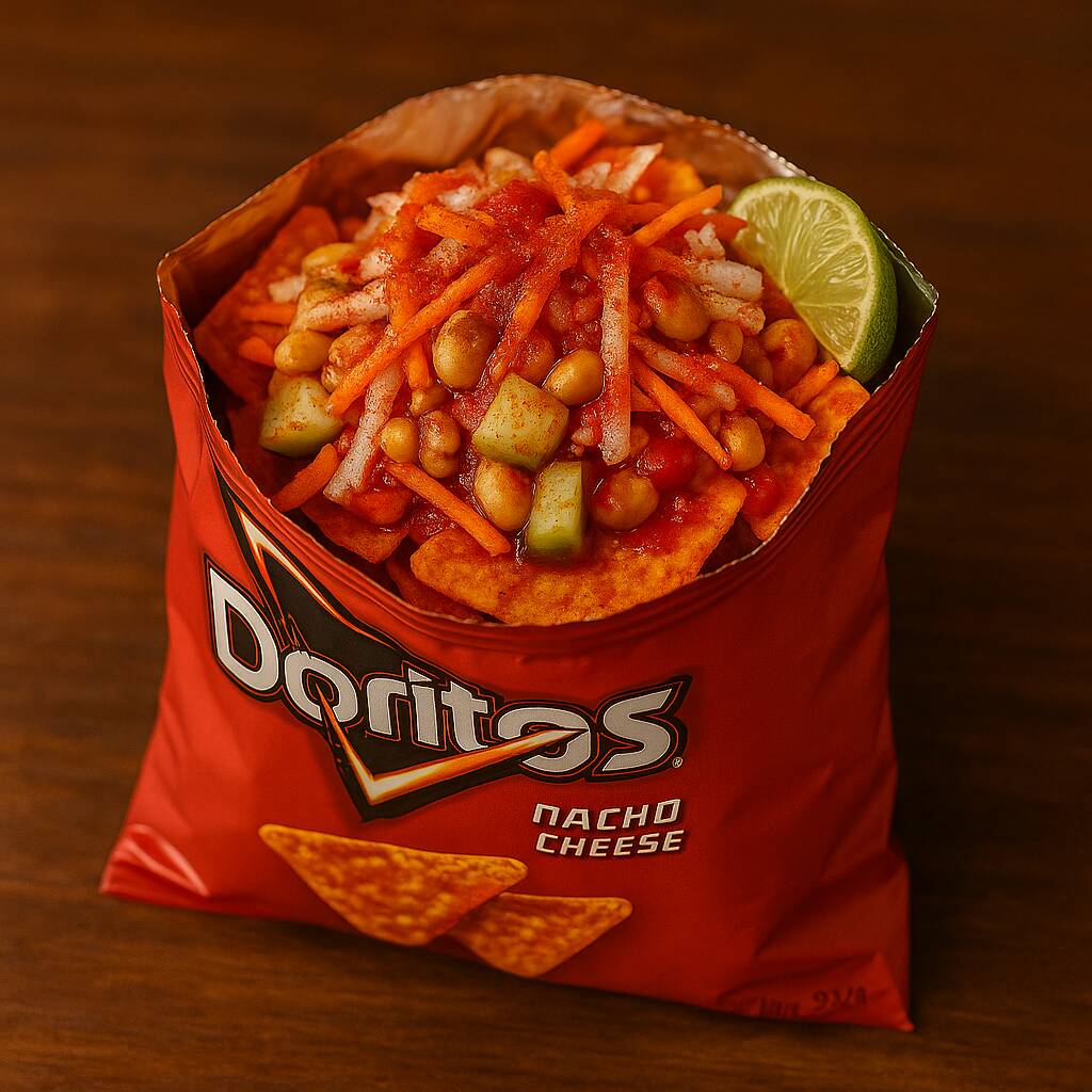 Doritos con jicama, zanahoria, pepino, cacahuates, miguelito, chamoy, limón y salsa