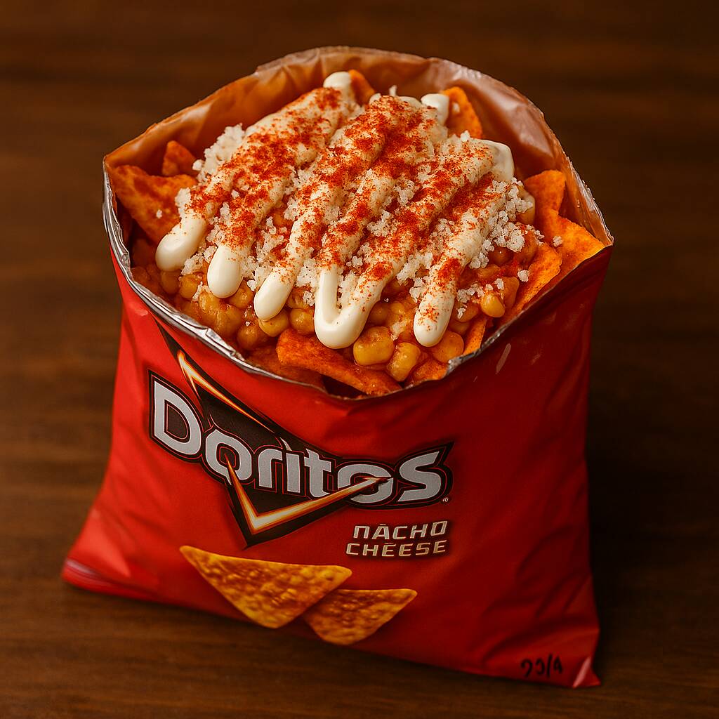 Doritos con esquites, mayonesa, chile, limón y queso